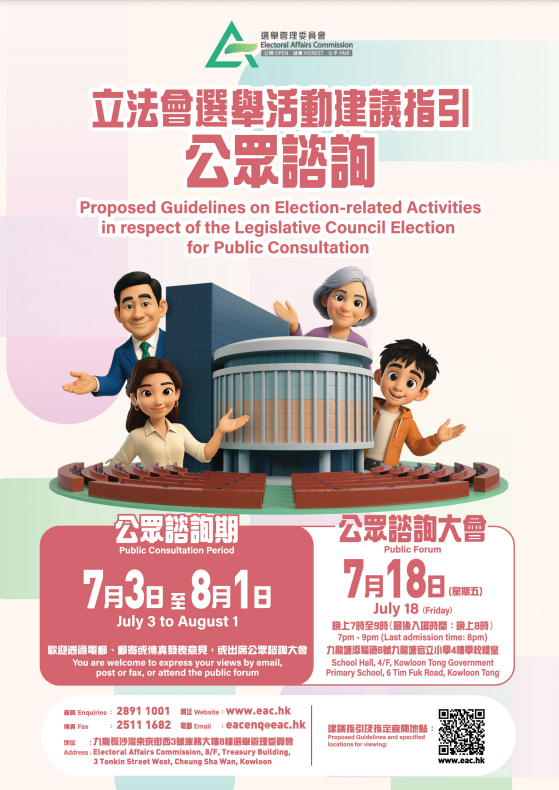 大公文匯全媒體報道,2025年立法會換屆選舉將於12月7日舉行,選舉管理委員會今日(3日)公布就立法會選舉活動建議指引作公眾諮詢,諮詢為期30日,至8月1日為止。