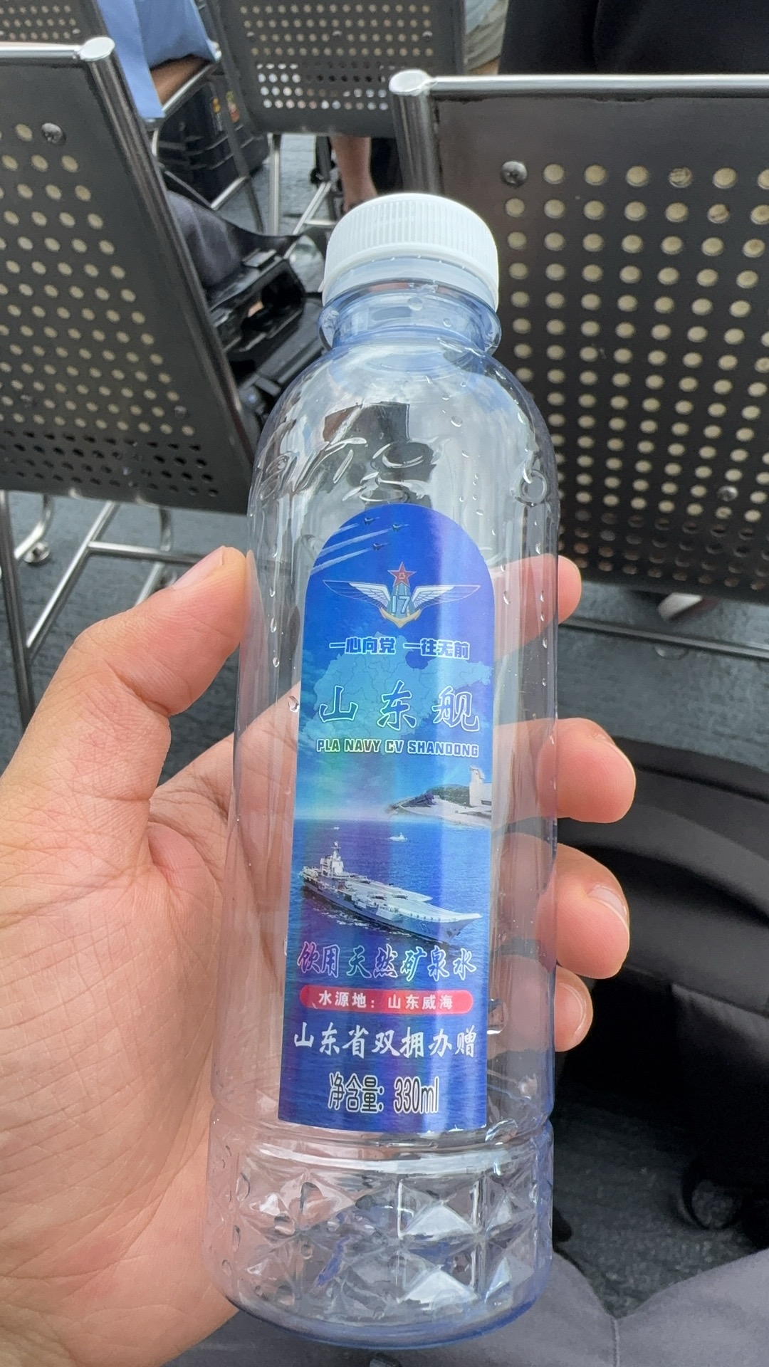在等待拍攝報道甲板招待會期間,我收到了第一份來自山東艦的「紀念品」——一瓶貼着山東艦標籤的天然礦泉水。在山東艦上將這瓶礦泉水一飲而盡,正正緩解了烈日當頭熱浪重重的高溫,倍感舒適。