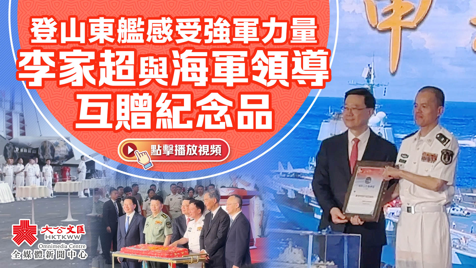 李家超與海軍領導互相贈送紀念品作為禮物。隨後,李家超與海軍副政治委員程堅中將共同切開蛋糕,慶祝山東艦航母編隊訪港這一意義重大的時刻。