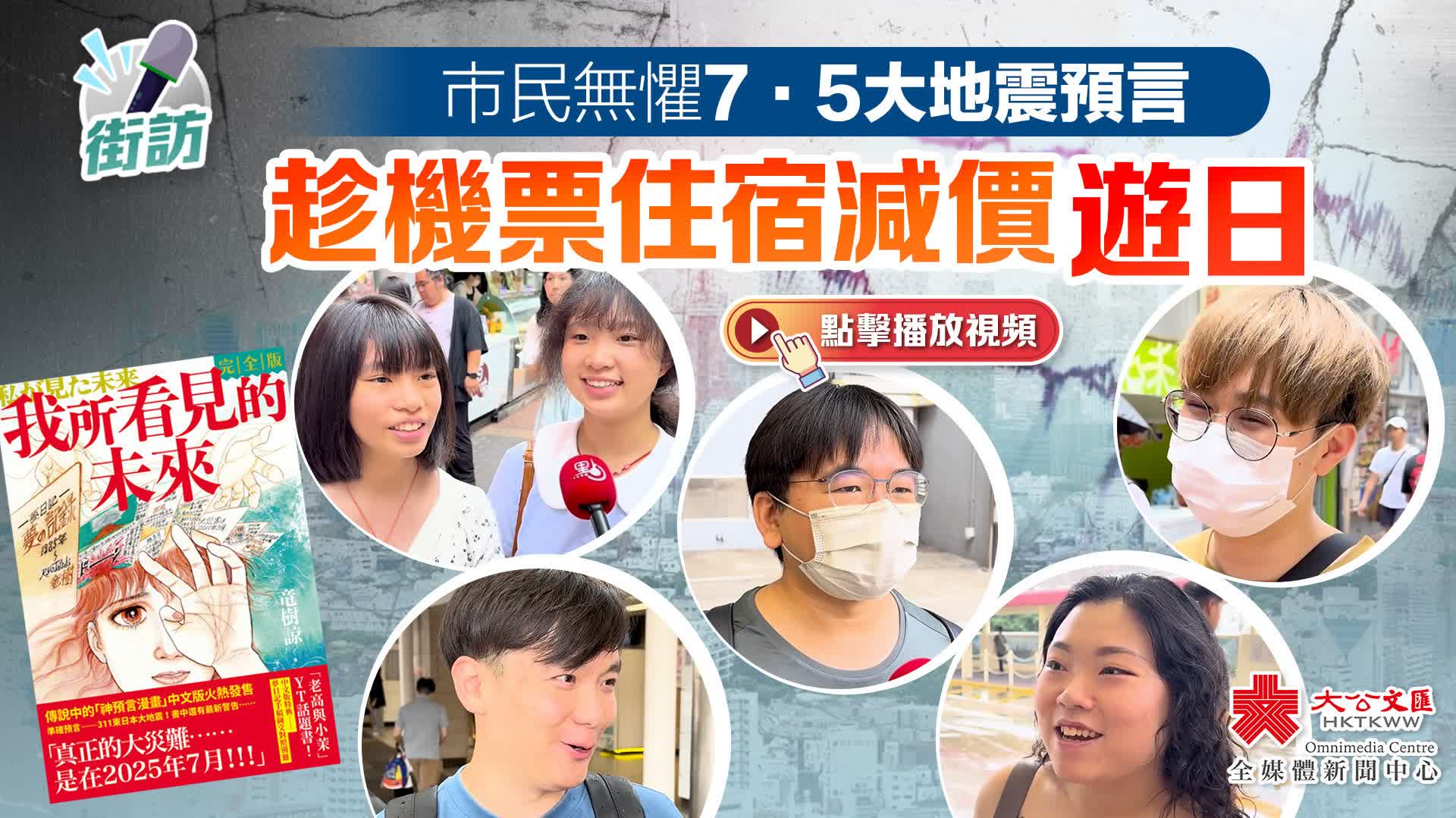 (大公文匯全媒體 記者 王俊傑)近期日本多次發生小規模地震,單是南部鹿兒島縣曾經五天內發生超過400次有感地震,令人不禁聯想起日本知名漫畫家龍樹諒的7月5日大地震預言。大公文匯全媒體訪問多位市民,其中有人無懼大地震預言,計劃趁機票住宿減價遊日。