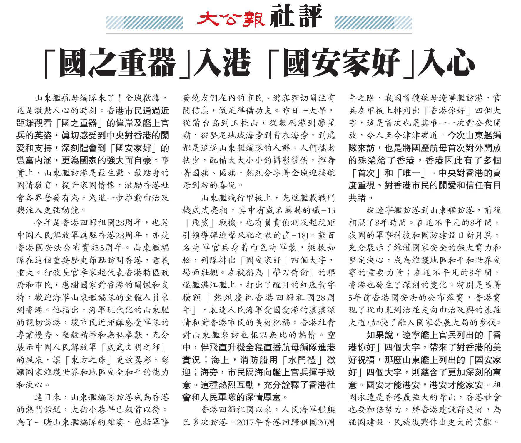 山東艦飛行甲板上,先進艦載戰鬥機威武亮相,其中有威名赫赫的殲-15「飛鯊」戰機,也有負責偵測及超視距引領導彈迎擊來犯之敵的直-18J。數百名海軍官兵身着白色海軍裝,挺拔如松,列隊排出「國安家好」四個大字,場面壯觀。在被稱為「帶刀侍衛」的驅逐艦湛江艦上,打出了醒目的紅底黃字橫額「熱烈慶祝香港回歸祖國28周年」,表達人民海軍愛國愛港的濃濃深情和對香港市民的美好祝福。香港社會對山東艦來訪也報以無比的熱情。空中,伴飛直升機全程直播航母編隊進港實況;海上,消防船用「水門禮」歡迎;海旁,市民隔海向艦上官兵揮手致意。這種熱烈互動,充分詮釋了香港社會和人民軍隊的深情厚意。