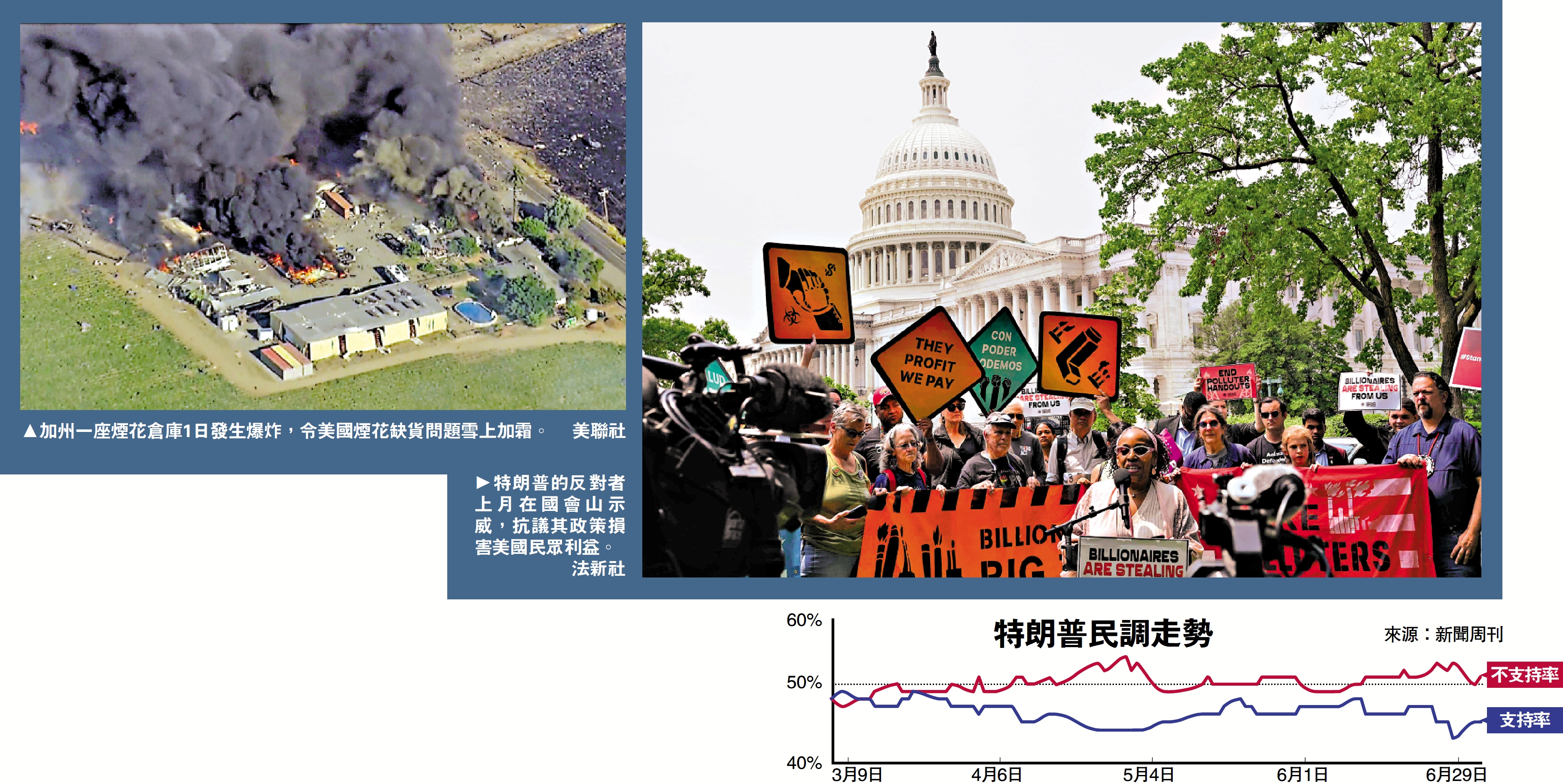 大公報綜合報道,7月4日是美國獨立日,但美國總統特朗普的關稅政策令今年的慶祝活動籠罩在陰霾下。美國煙花協會表示,美國用於慶祝獨立日的煙花幾乎完全依賴中國供應,特朗普濫徵關稅,導致美國市場上的煙花供應減少、價格上漲,明年的獨立250周年慶典也岌岌可危。美聯儲主席鮑威爾警告說,關稅的負面影響將在未來幾個月進一步顯現,美國通脹率料持續升高。近期的民調顯示,美國民眾對特朗普失去信心,其支持率一路走低。