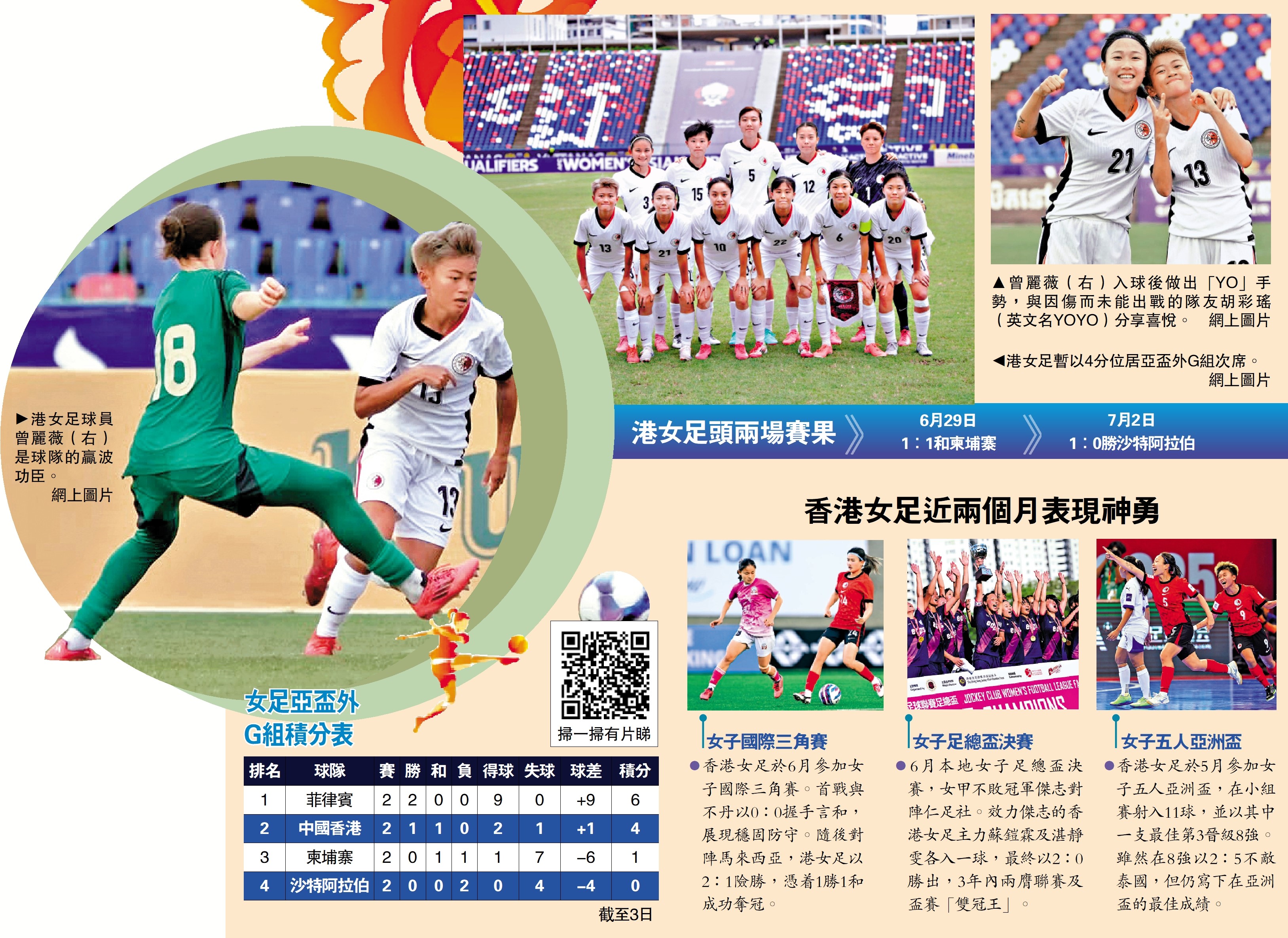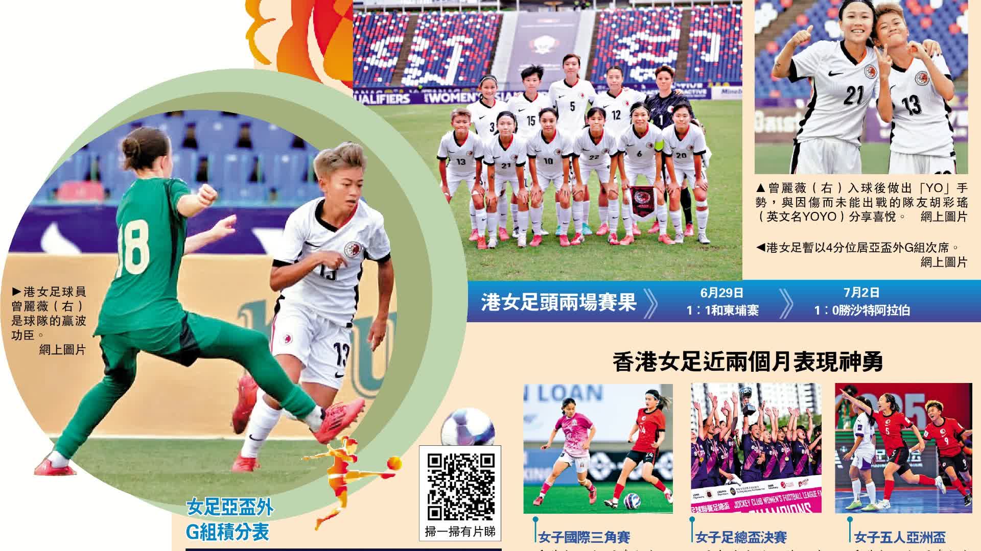 同組另一仗,菲律賓以6:0大勝柬埔寨,目前以6分領跑。港女足如想獲得出線席位,必須在明午5時的比賽中取勝。