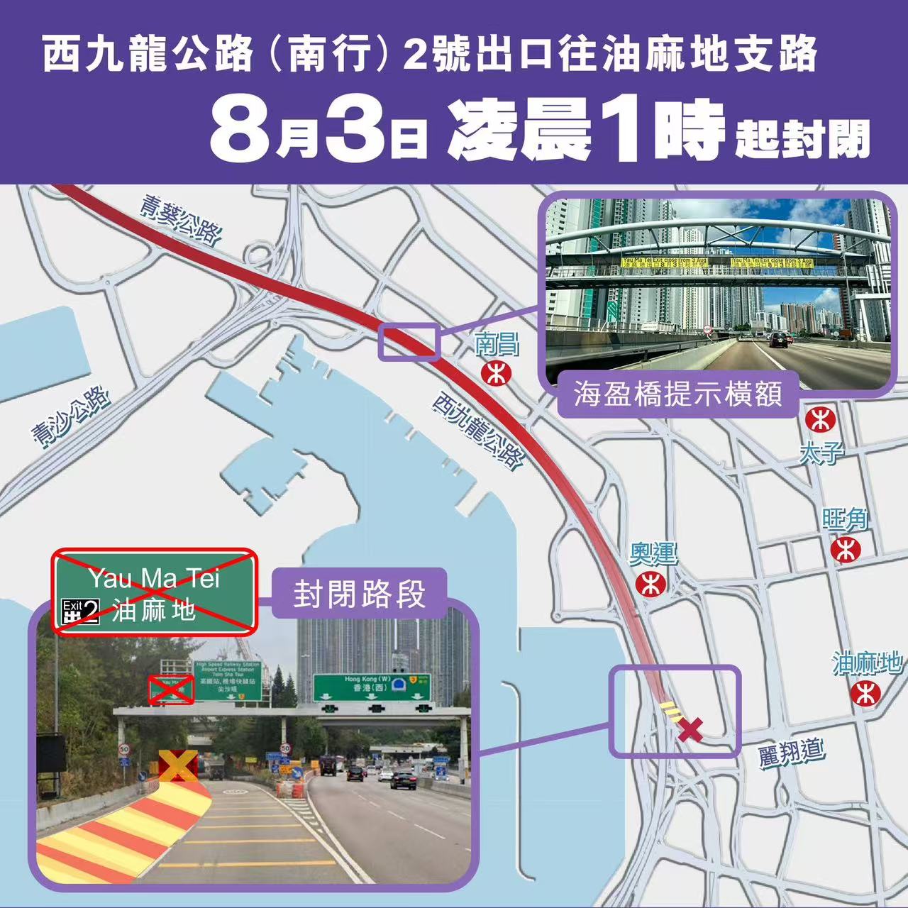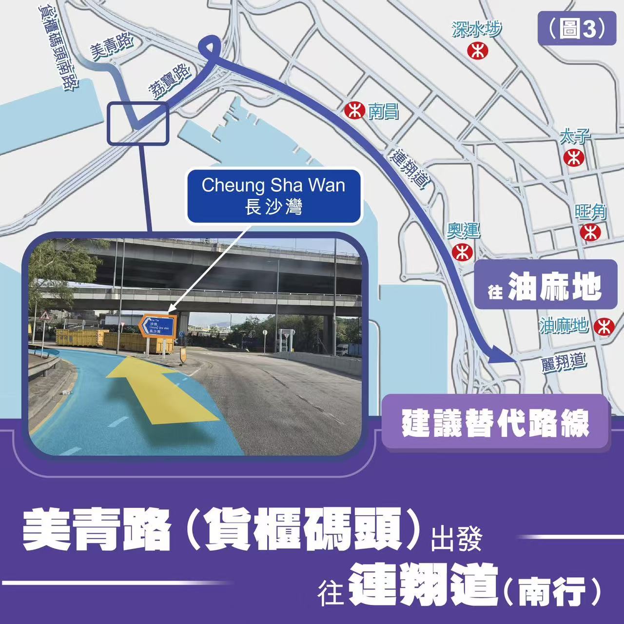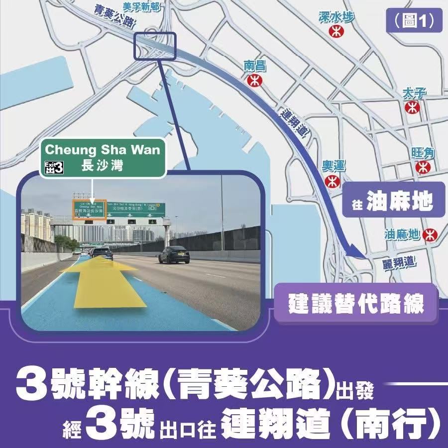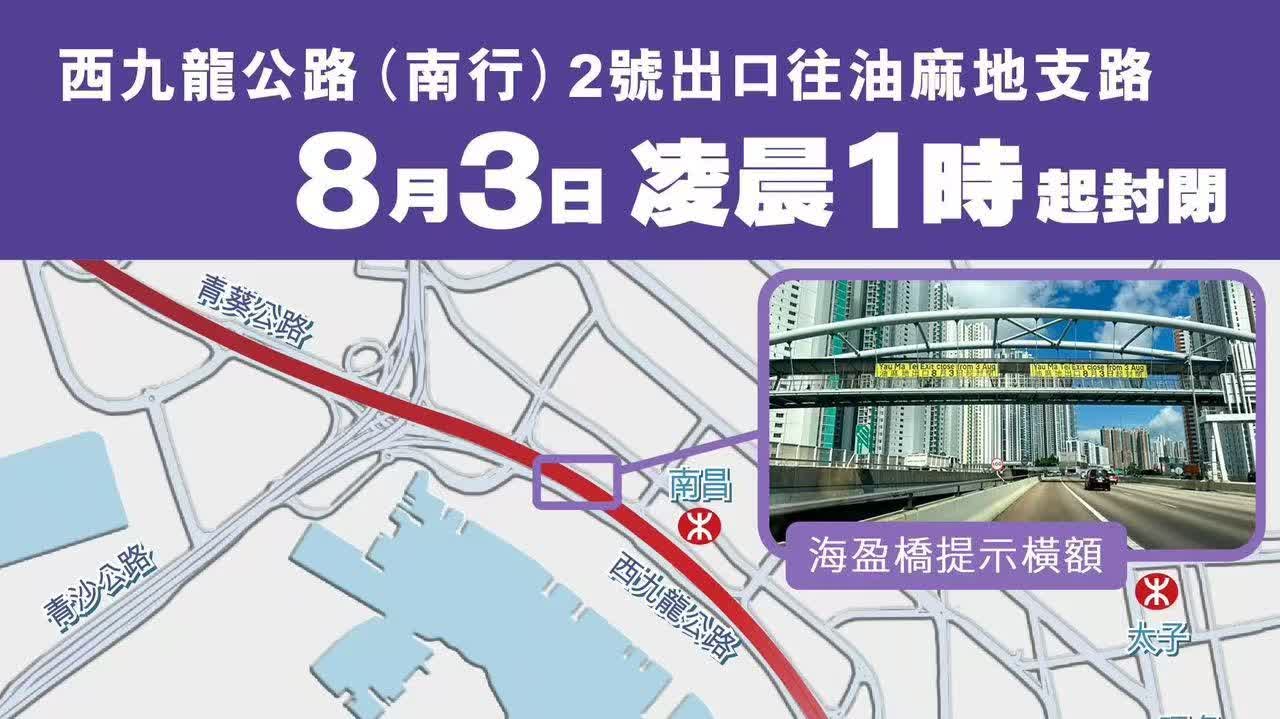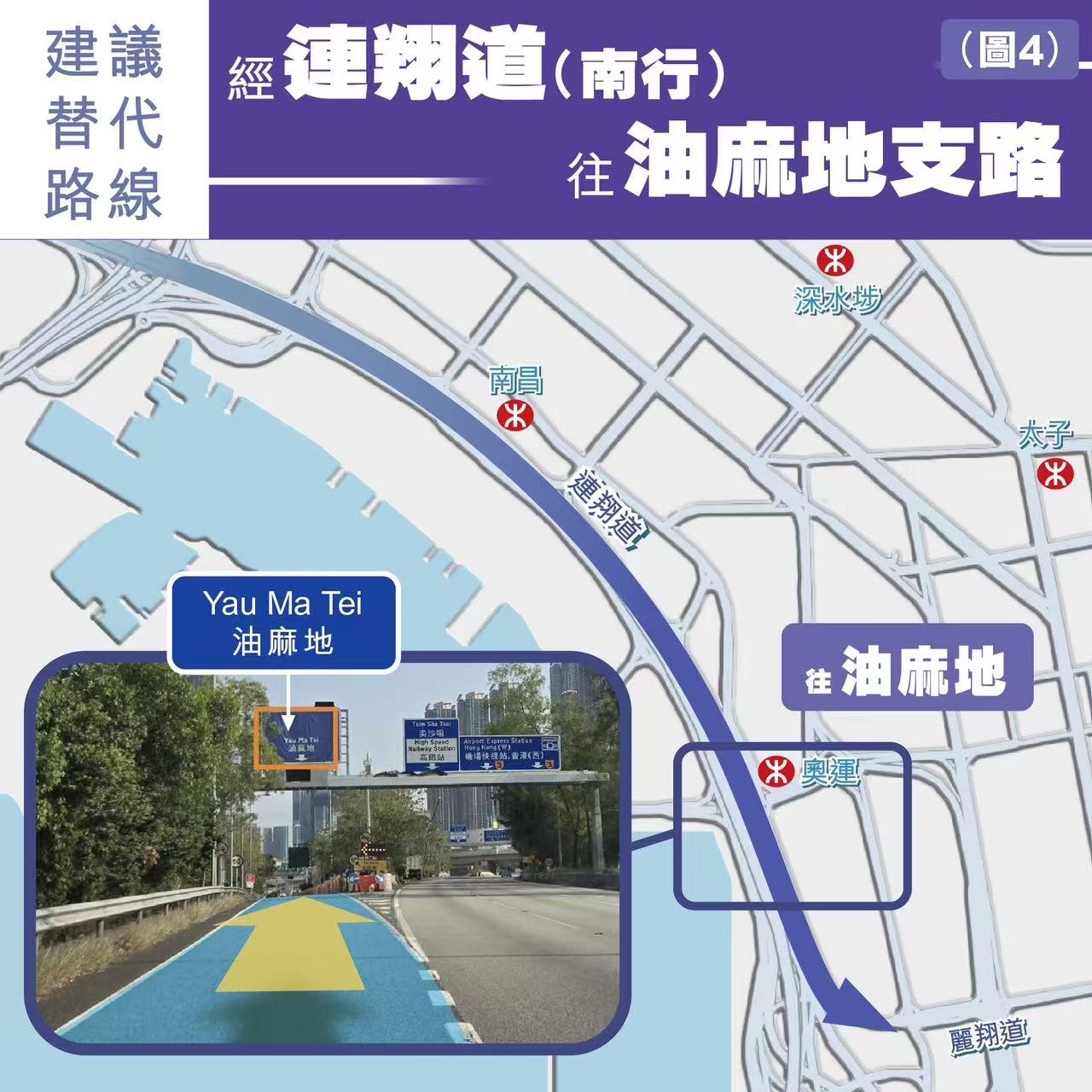 大公文匯全媒體報道,路政署今日(4日)在社交專頁發文表示,為配合中九龍繞道(油麻地段)入口建造工程,西九龍公路南行前往油麻地,8月3日凌晨1時起需改經連翔道。署方已在西九龍公路的海盈橋設立提示橫額,並提供不同替代路線圖,提醒駕駛者從不同出發點改經連翔道,及駛入連翔道後前往油麻地的路線。