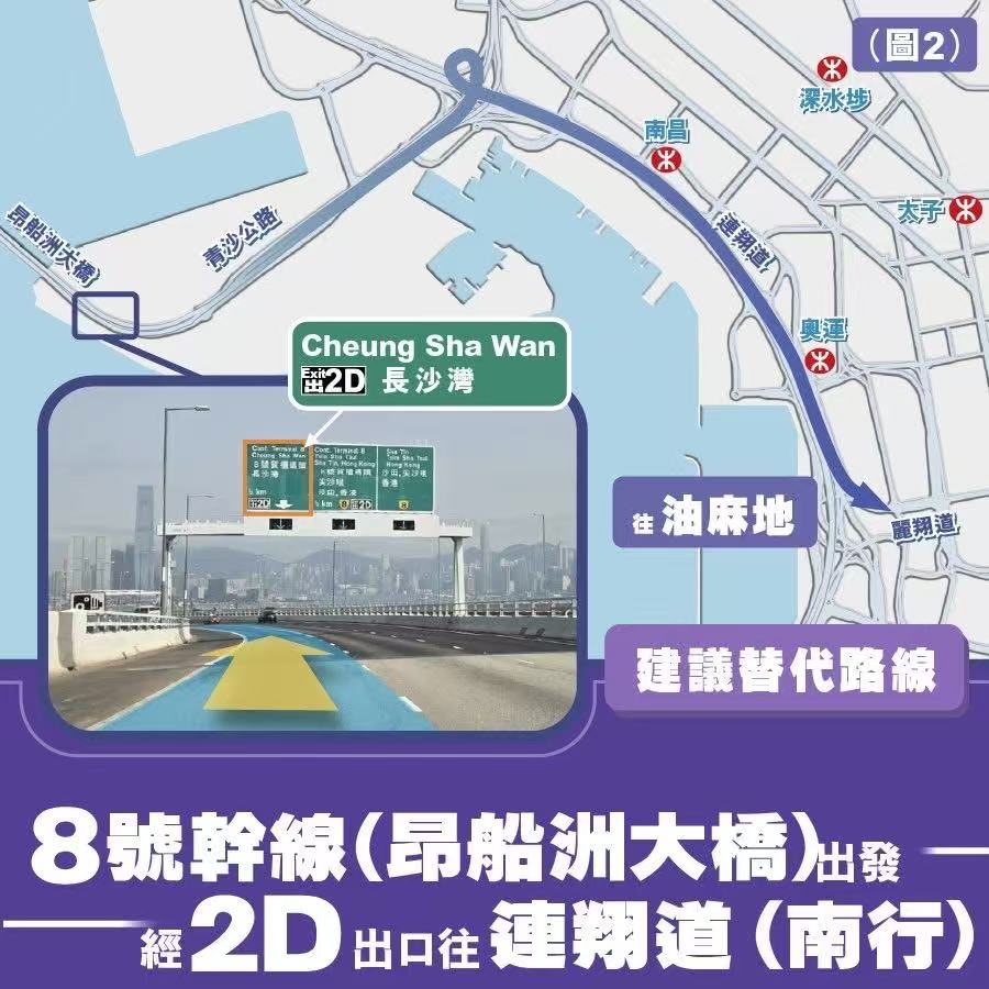 路線二:從昂船洲大橋8號幹線出發,經2D出口往連翔道南行。