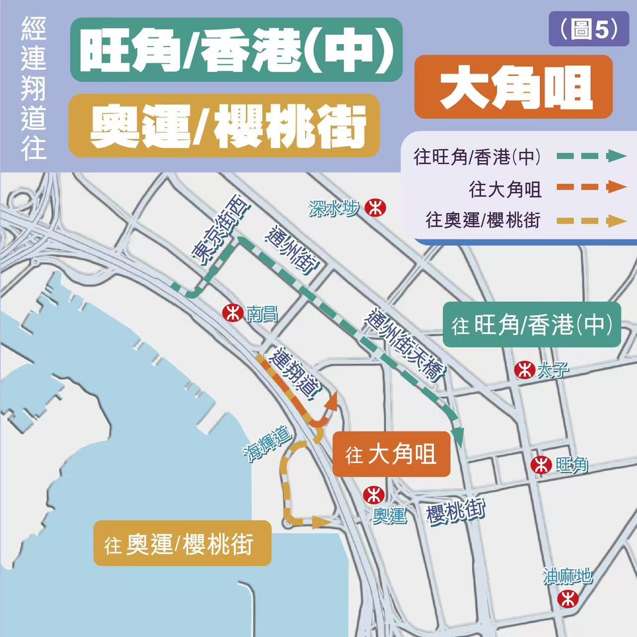 路線五:經連翔道後經通州街、通州街天橋往旺角/香港(中);
