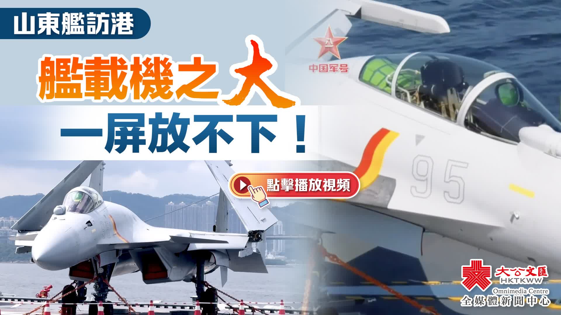 山東艦艦體威武雄壯,甲板上整齊排列着殲-15、殲-15T艦載戰鬥機,展現出中國航母戰鬥群的實戰能力。中國軍號今日發布影片展示殲-15T艦載機,並配文「問:把殲-15T放在手機裏需要多少秒?答:至少12秒才能看完!」