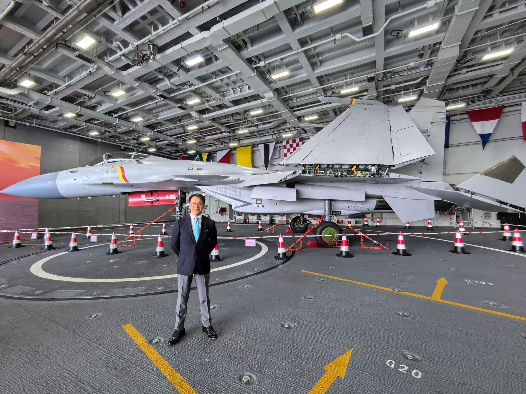 民建聯主席陳克勤今日在社交專頁發文表示,昨日登臨這艘由我國自主研發製作的航空母艦,參加山東艦航母編隊訪港甲板招待會。站在「山東艦」宏偉的機庫,兩架線條硬朗、氣勢磅礴的殲-15艦載戰鬥機,折起雙翼分列於機庫兩側。這架殲-15艦載戰機,從設計圖紙到翱翔海天,凝聚了無數科研人員、工程師、試飛員和軍工人的智慧與汗水。它是鋼鐵的翅膀,更是民族自強不息精神的象徵。