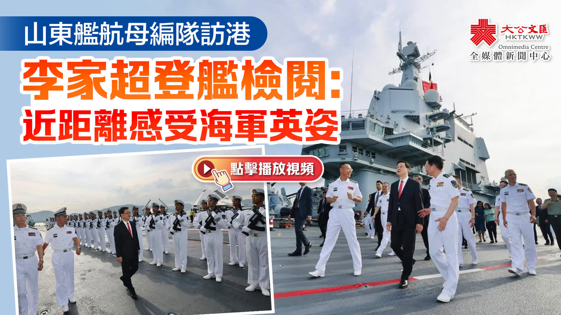 李家超今日(4日)在社交專頁發布短片,分享他參觀山東艦的歷程。畫面顯示,李家超出席中國人民解放軍海軍「山東艦」航母甲板招待會,並檢閱儀仗隊、聽取講解,近距離感受海軍的英姿。最後,李家超一行人在起飛位前留影,共享這一偉大時刻。
