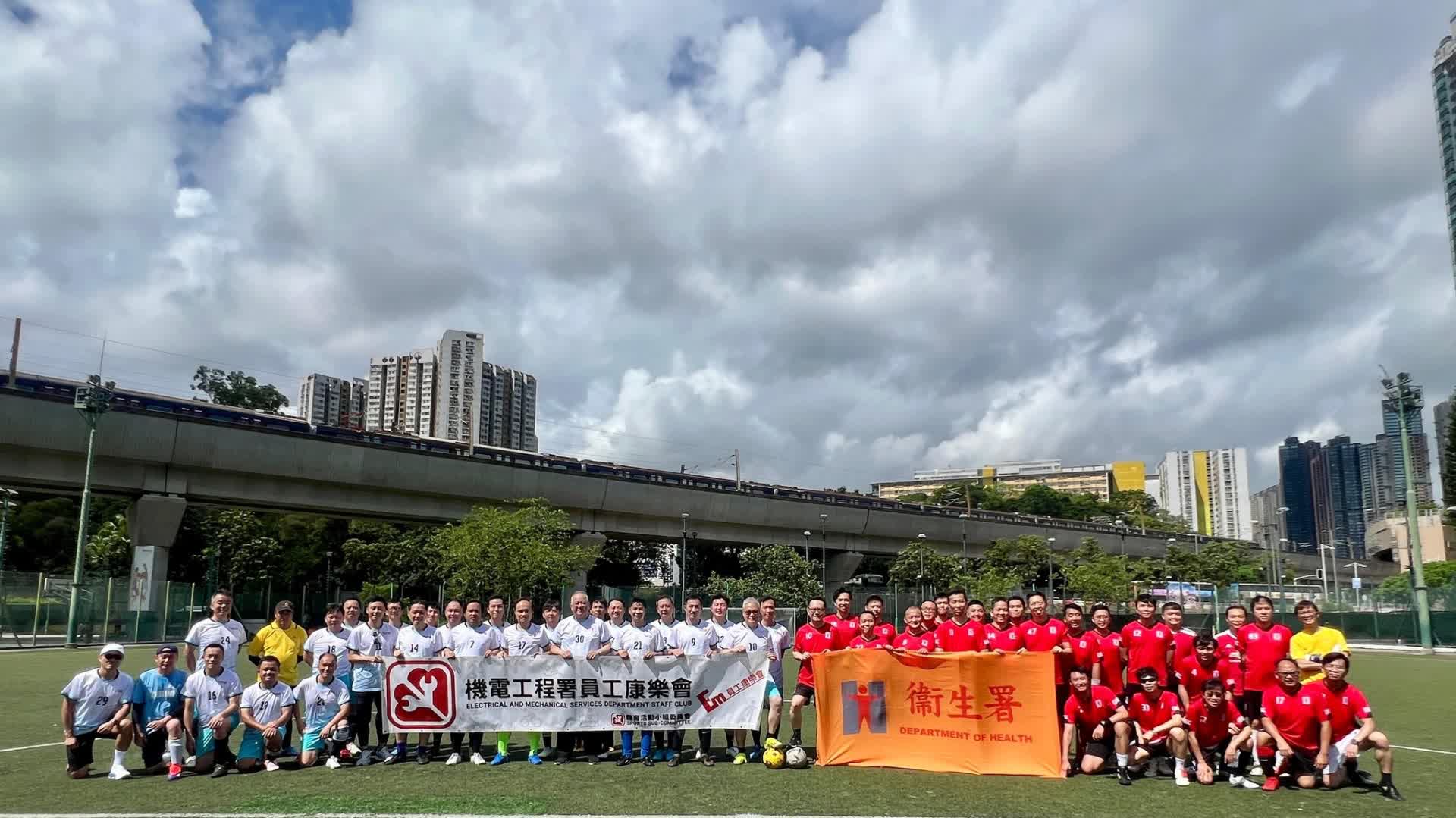 比賽前,本署署長林文健醫生及機電工程署署長潘國英先和隊員們大合照,並交換錦旗,完成簡單而隆重的開球禮。兩位署長亦有披甲上陣,帶領隊員衝鋒陷陣。雙方互有攻守,現場歡呼聲不斷,氣氛熱鬧,最終以2:2握手言和,為精彩賽事寫下完滿句號。