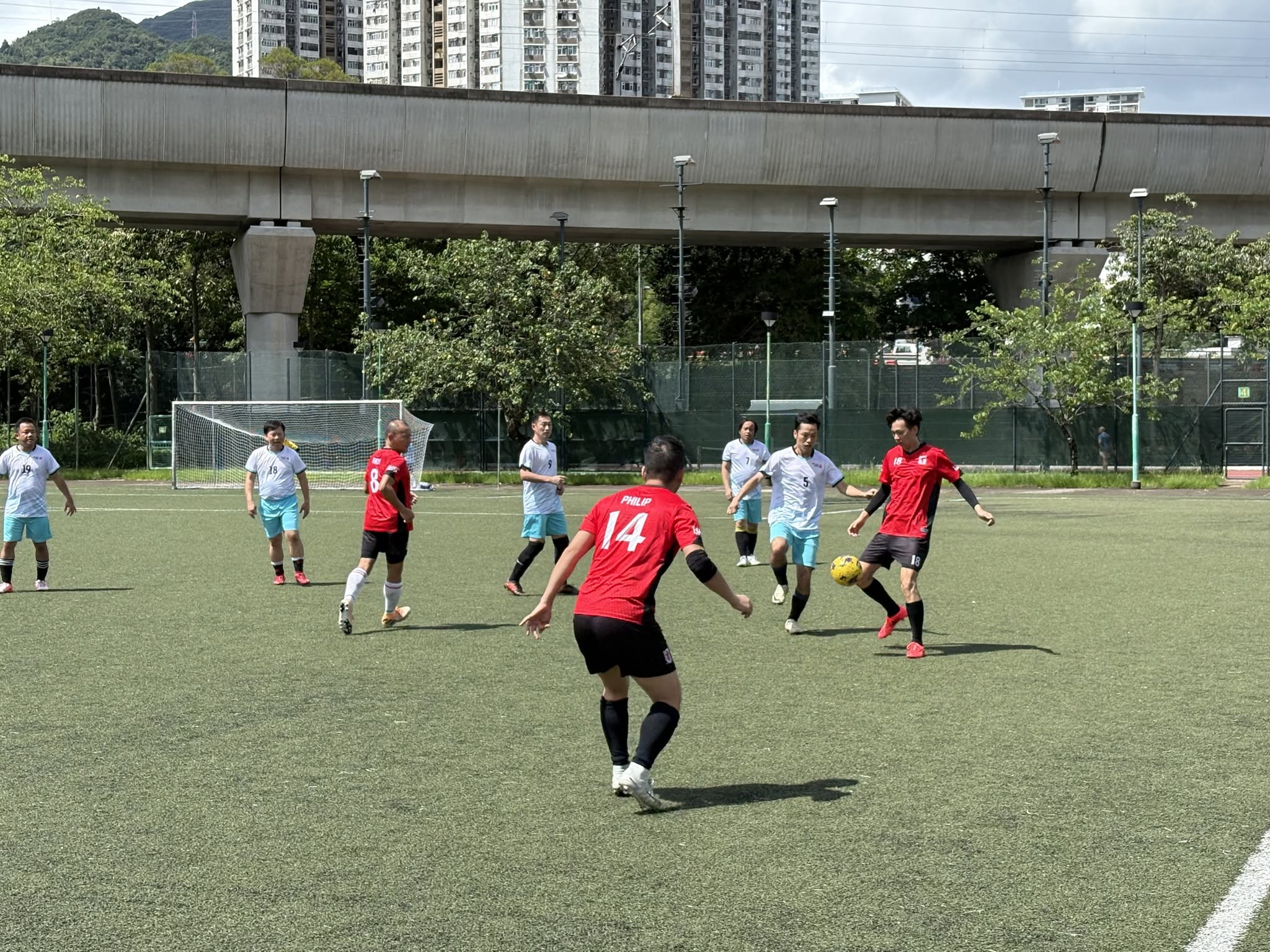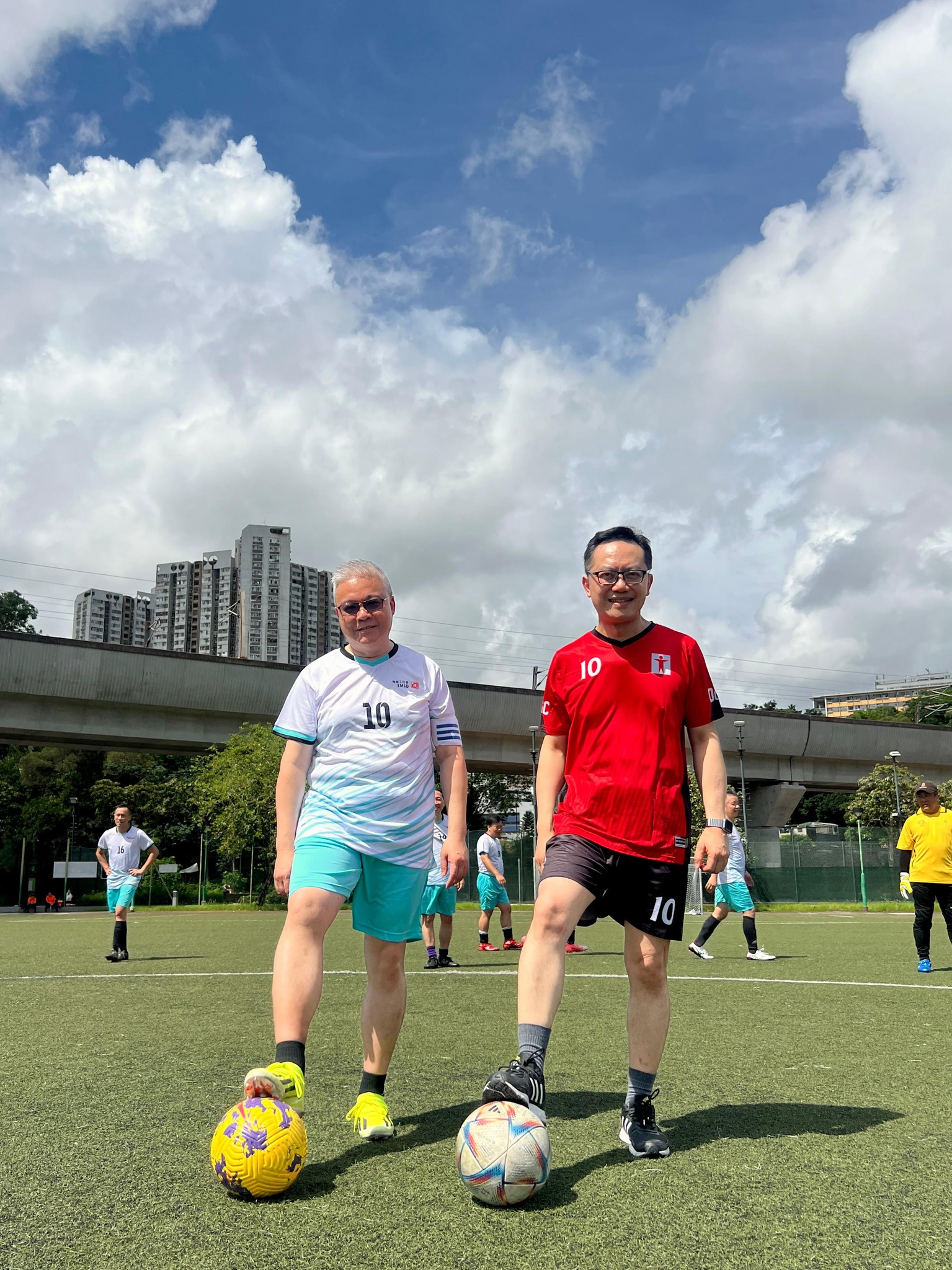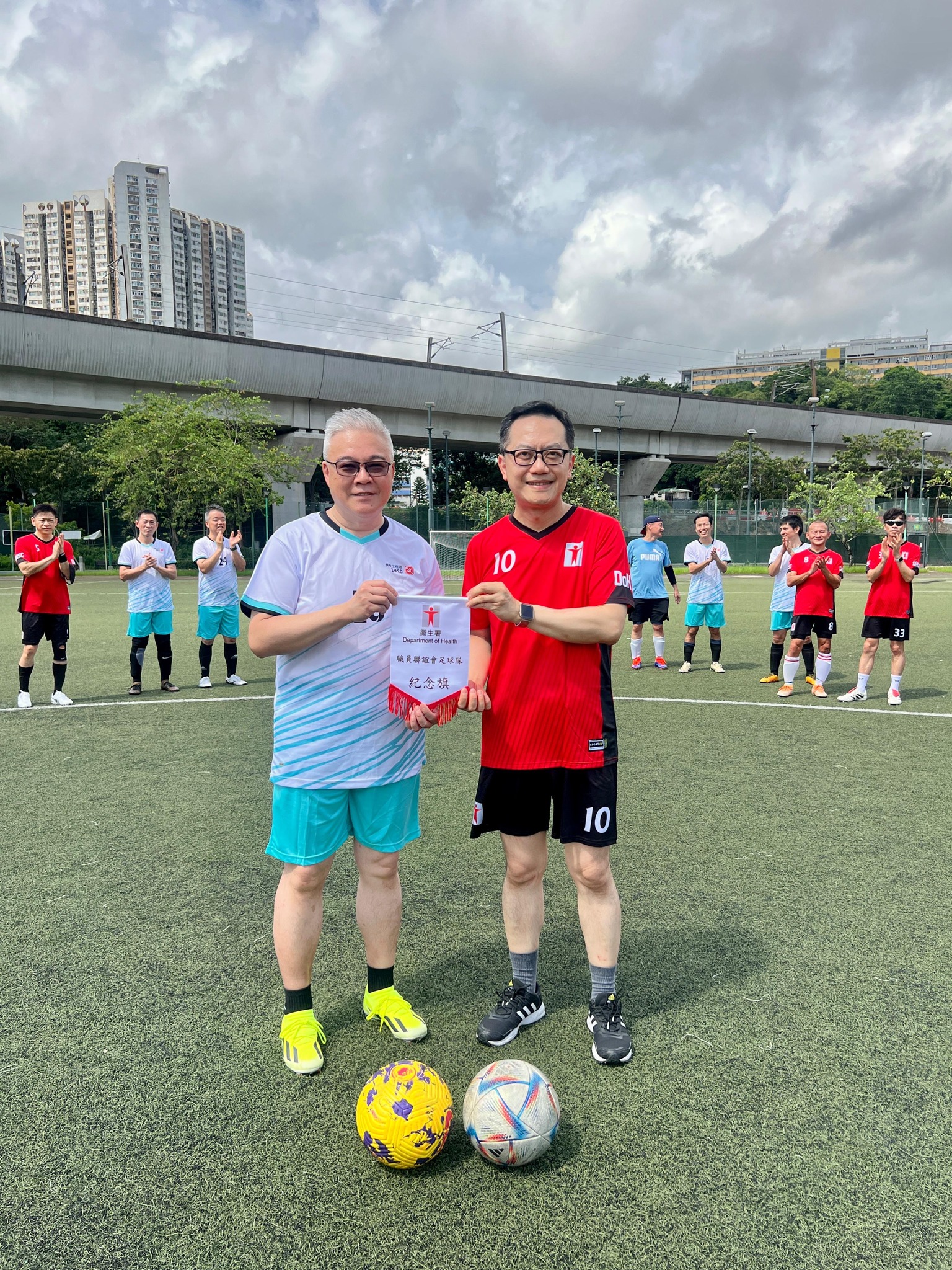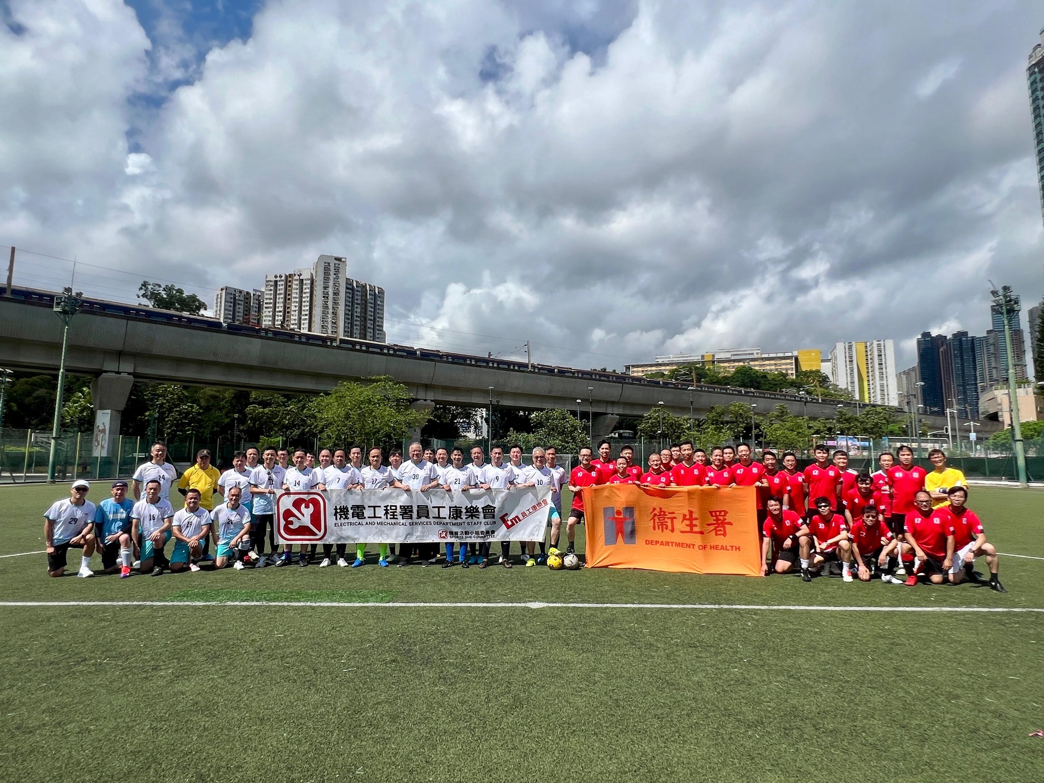 剛過去的周日,衞生署職員聯誼會足球隊與機電工程署足球隊在沙田曾大屋遊樂場進行了一場精彩的友誼賽!雖然當日天氣陰晴不定,還飄着微雨,但無減隊員們的昂揚鬥志。幸好天公造美,偶爾露出一抹陽光,為當日賽事增添一份暖意,大家亦立即抓緊時間,全力作賽。