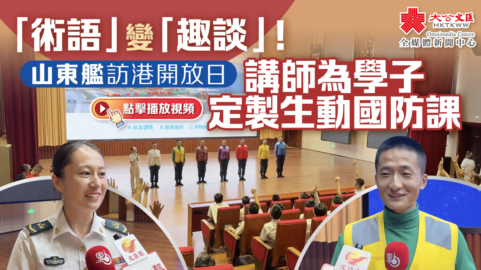 大公文匯全媒體報道,由航母山東艦,導彈驅逐艦延安艦、湛江艦,導彈護衛艦運城艦組成的海軍艦艇編隊,自7月3日起訪港5天。今日(7月4日),山東艦面向學生等群體開放,作為開放日的重要環節,隨艦而來的國防知識講座老師為學子們帶來了一場別開生面、互動熱烈的國防教育課,現場氣氛高漲,學子反響熱烈。