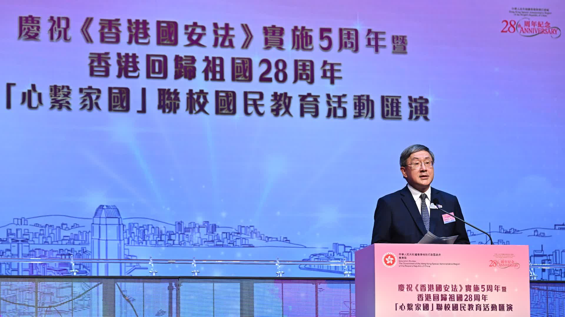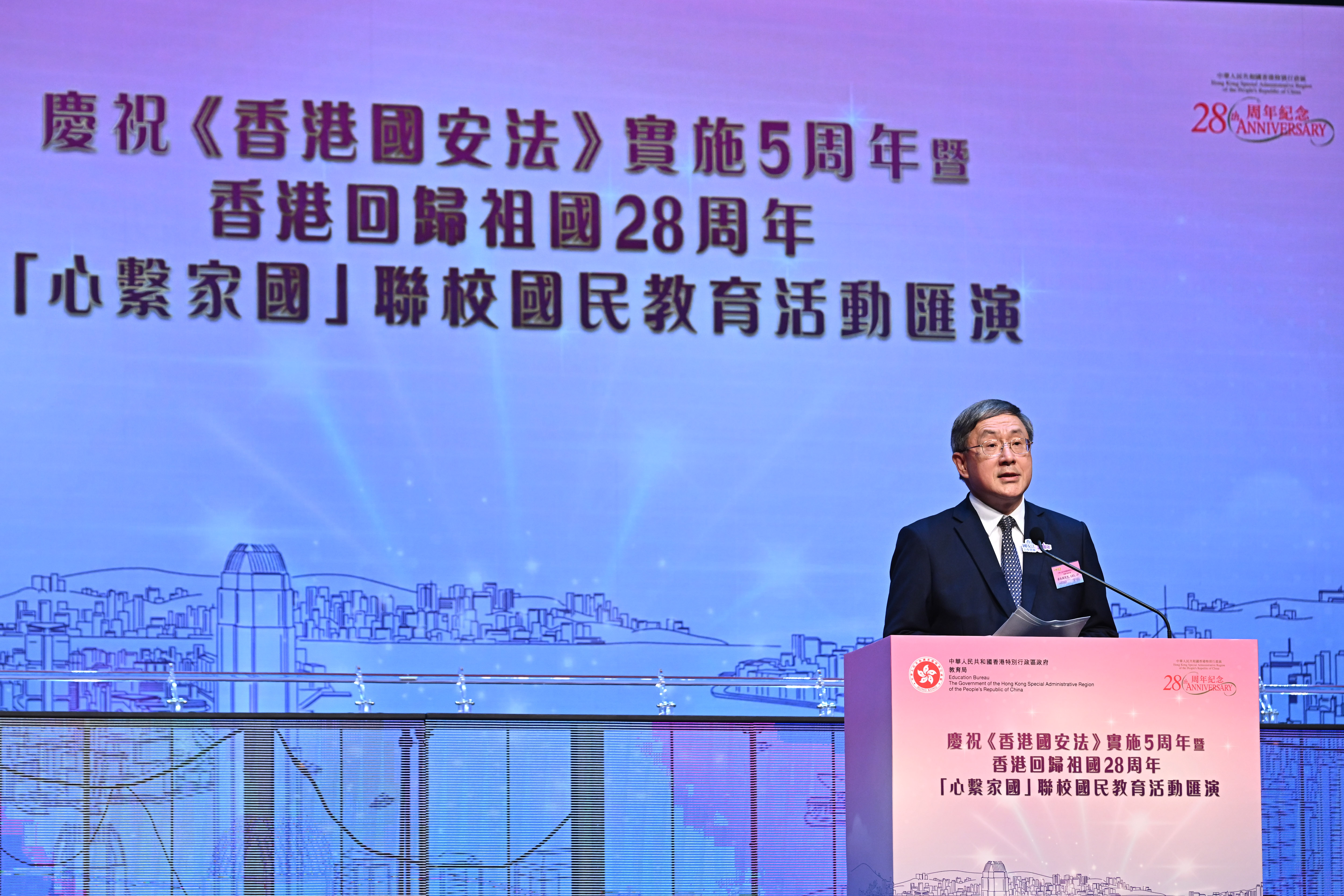 大公文匯全媒體報道,教育局今日(4日)舉行慶祝香港國安法實施5周年暨香港回歸祖國28周年「心繫家國」聯校國民教育活動匯演,展示本學年「心繫家國」活動的豐碩成果。政務司副司長卓永興及教育局局長蔡若蓮一同為活動主禮,約2000位辦學團體、學校議會、校長會、學校和家校會代表參與。