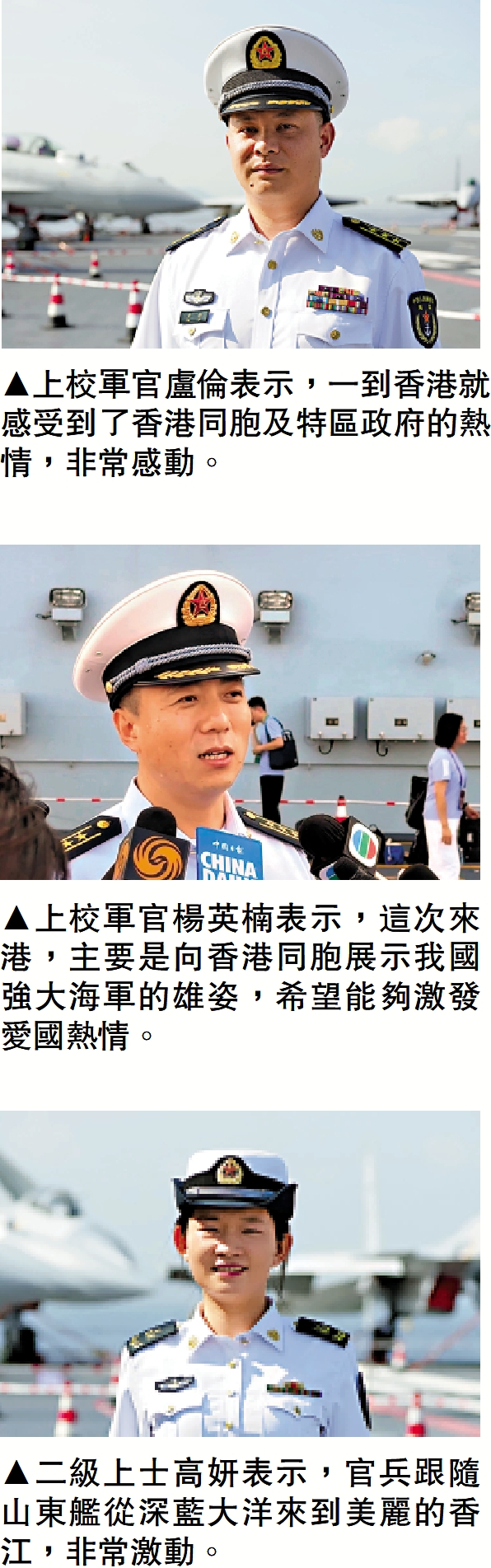 被問到山東艦來到香港,上校軍官盧倫及戰友們心情如何時?盧倫表示,「我們來香港非常高興,大家早前聽到即將訪港的消息都非常的激動。」他說到,自己對1997年香港回歸的時刻印象非常深刻,「當時,我在電視機前聽着《東方之珠》的歌曲,就想到要是有一天能夠到香港來看一看、走一走,那該多好啊!」