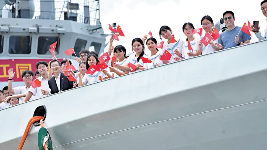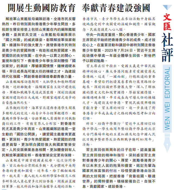 解放軍山東艦航母編隊訪港,全港市民反響熱烈,昨日特別面向香港青少年學生開放,多批師生獲安排登上包括山東艦在內的編隊艦艇參觀,並與官兵交流。山東艦航母編隊展示「國之利器」的威武雄姿,彰顯解放軍保家衛國、維護和平的強大實力,激發香港市民特別是青少年的愛國熱情,有助形成熱愛國家、熱愛國防的良好氛圍。在中央一以貫之的關心、重視和指引下,香港青少年學生深刻體悟「國安家好」的真諦,厚植家國情懷,錘煉過硬本領,早日成長為可堪大任的棟樑之才,為建設現代化強國、開創香港新輝煌奉獻青春力量。