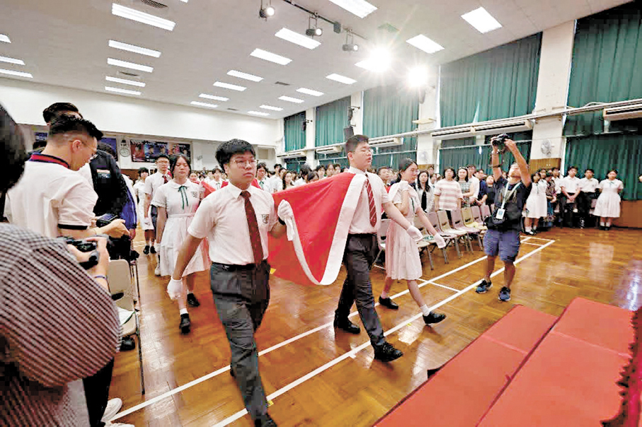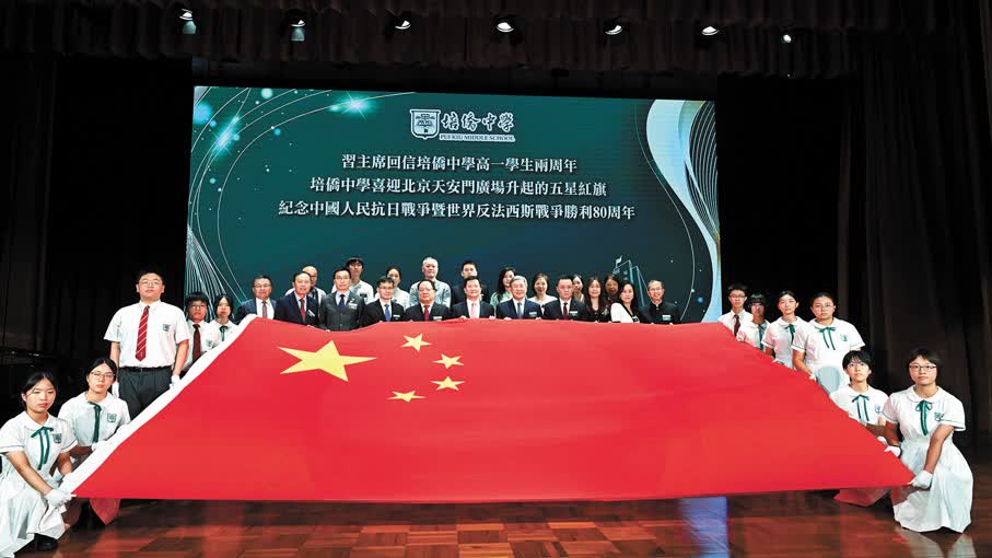 (香港文匯報記者 莫楠)今年7月1日,香港培僑中學60名師生赴京參與天安門升旗儀式,並獲贈2023年7月24日於天安門廣場升起、長5米寬3.3米的全國最大升掛國旗(編號2023-0205),當日正是習近平主席回信予培僑中學學生的日子,彰顯國家對培僑中學以至香港年輕一代的關懷、心思和鼓勵。培僑中學昨日舉行「習近平主席回信培僑中學高一學生兩周年暨培僑中學喜迎北京天安門廣場升起的五星紅旗及紀念中國人民抗日戰爭暨世界反法西斯戰爭勝利80周年」活動,邀請多名中央駐港機構及特區政府代表主禮,該校以及多所內地赴港交流學校約900名師生參與,一同感受此特別時刻。學校強調,會發揮天安門廣場國旗的愛國主義教育作用,不斷地增進香港青年學生對祖國的認同,樹立中華民族共同體的意識。