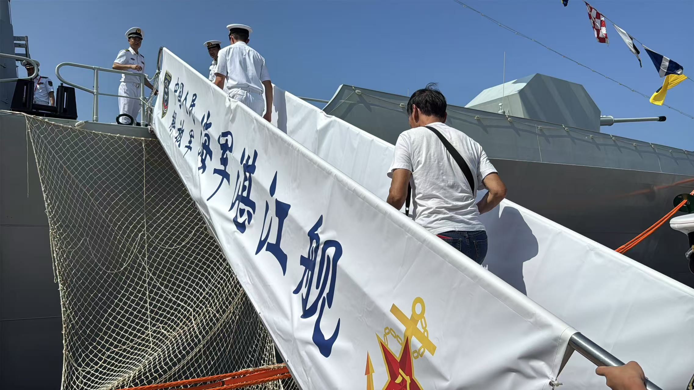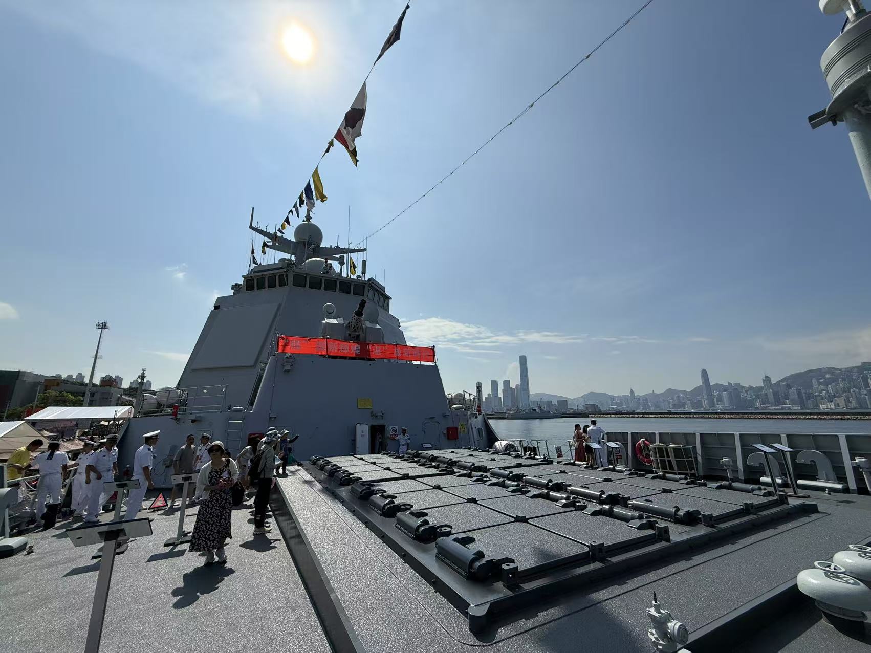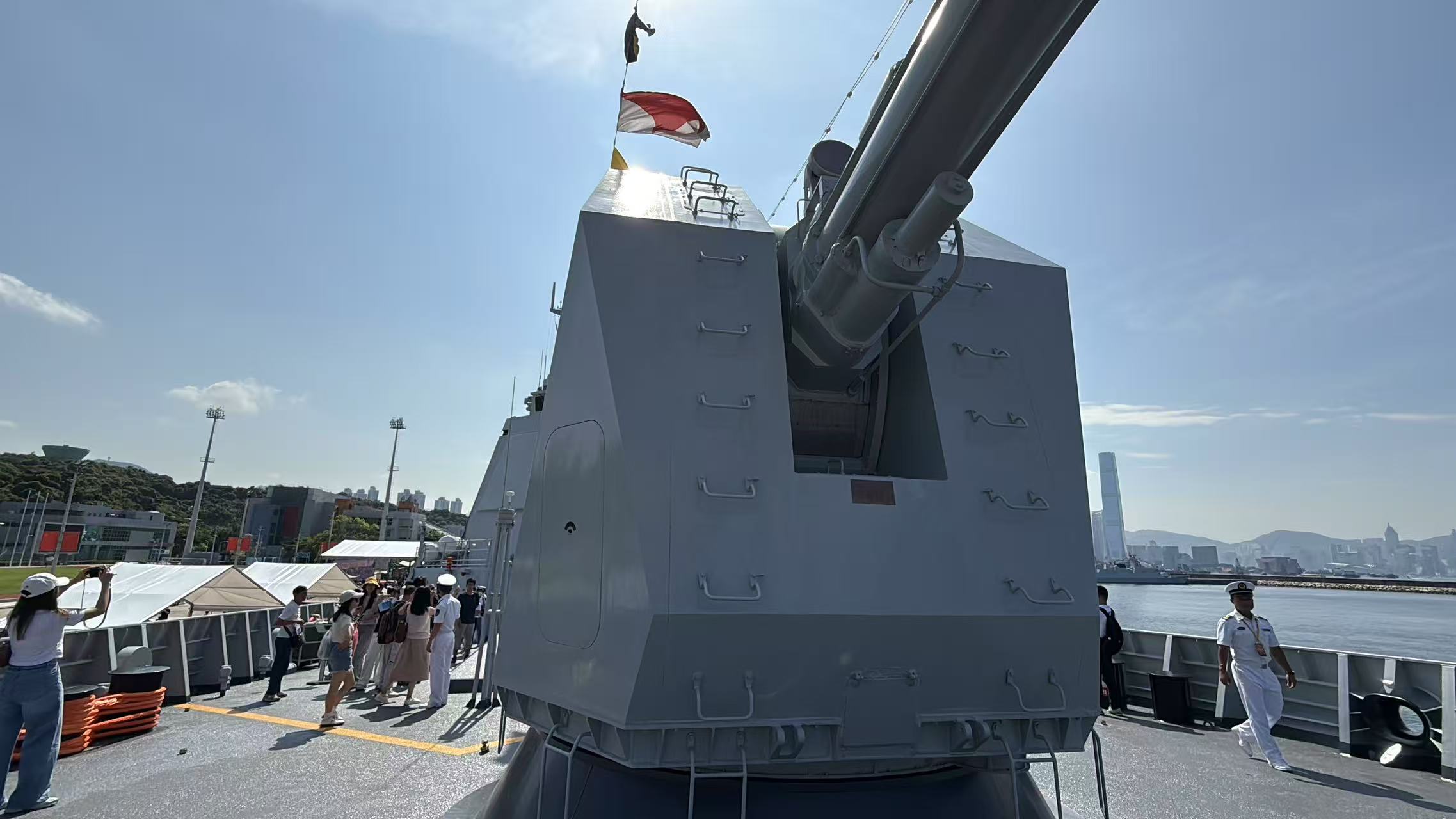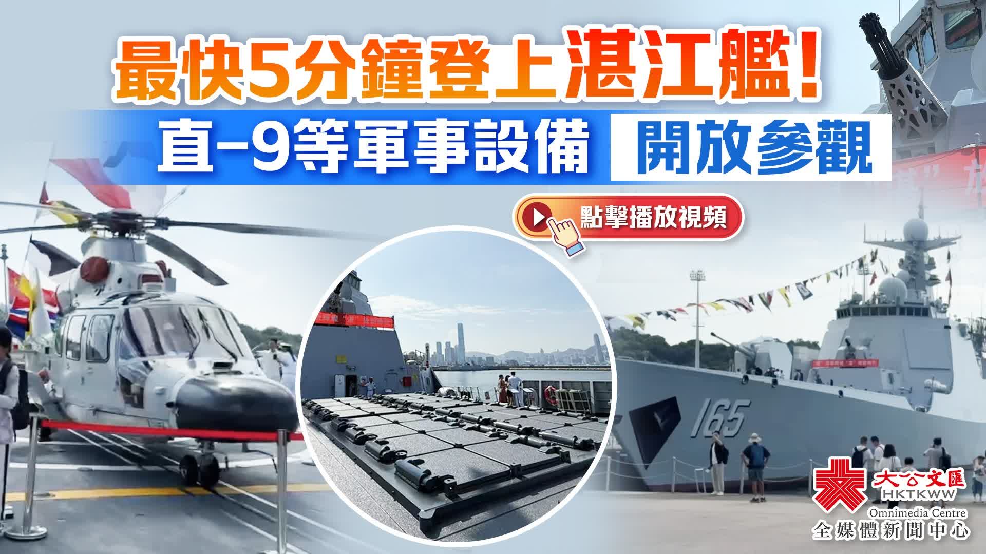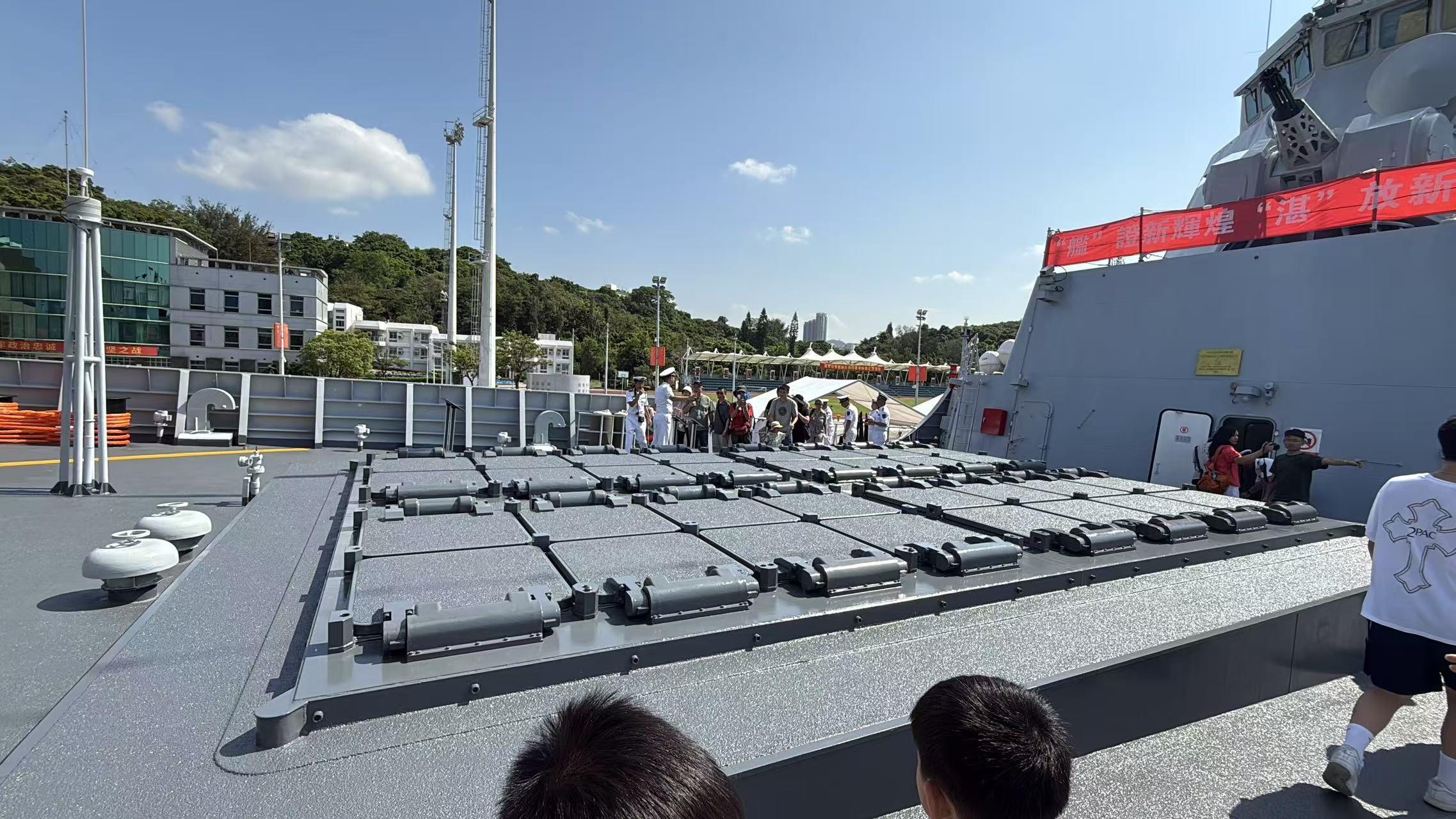 大公文匯全媒體報道,航空母艦山東艦,導彈驅逐艦延安艦、湛江艦,導彈護衛艦運城艦組成的海軍艦艇編隊,7月3日上午抵達香港,開啟一連5天的訪港活動。山東艦停泊在維港西錨地,湛江艦、運城艦停泊在昂船洲軍營碼頭,今日(5日)起面向公眾開放參觀。記者今早抵達昂船洲軍營,在登艦口等候區排隊5至10分鐘後,順利登上湛江艦進行參觀。