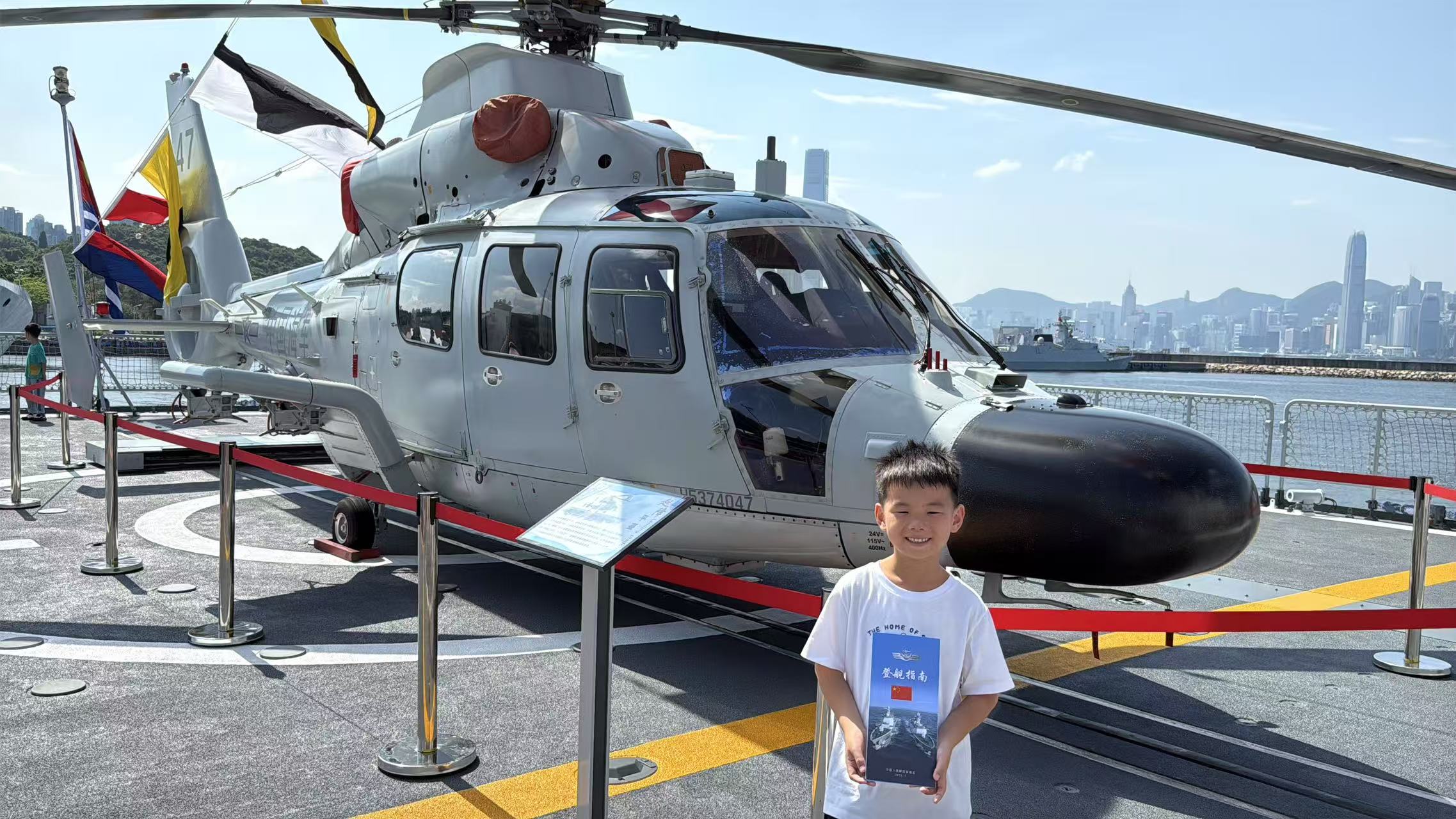 直-9艦載直升機停泊在飛行甲板上,吸引不少市民遊客合影留念。