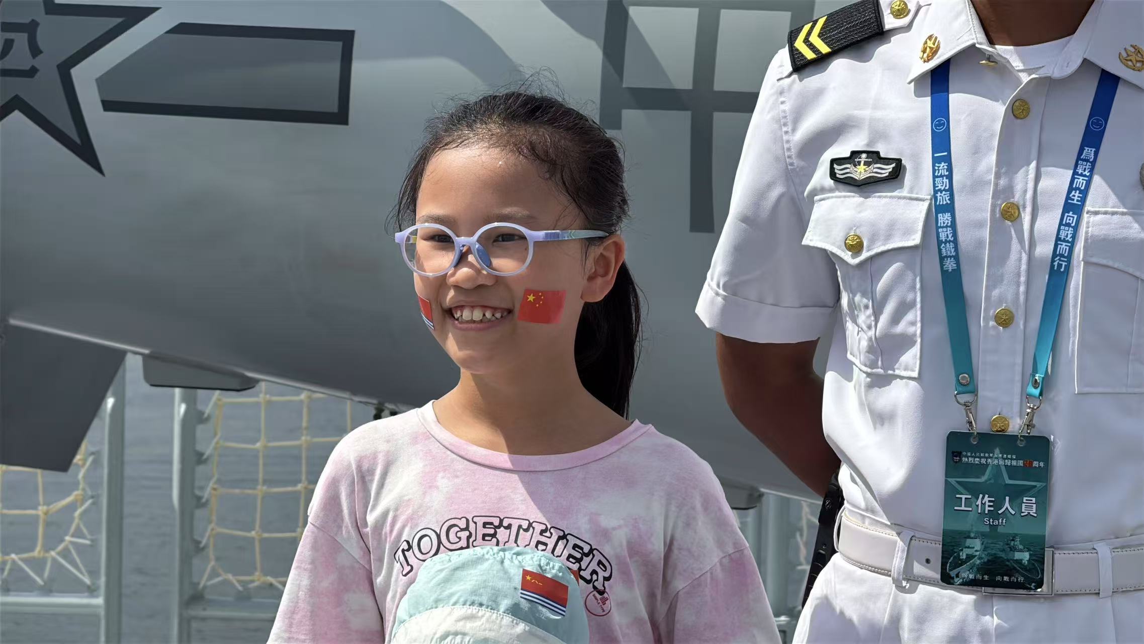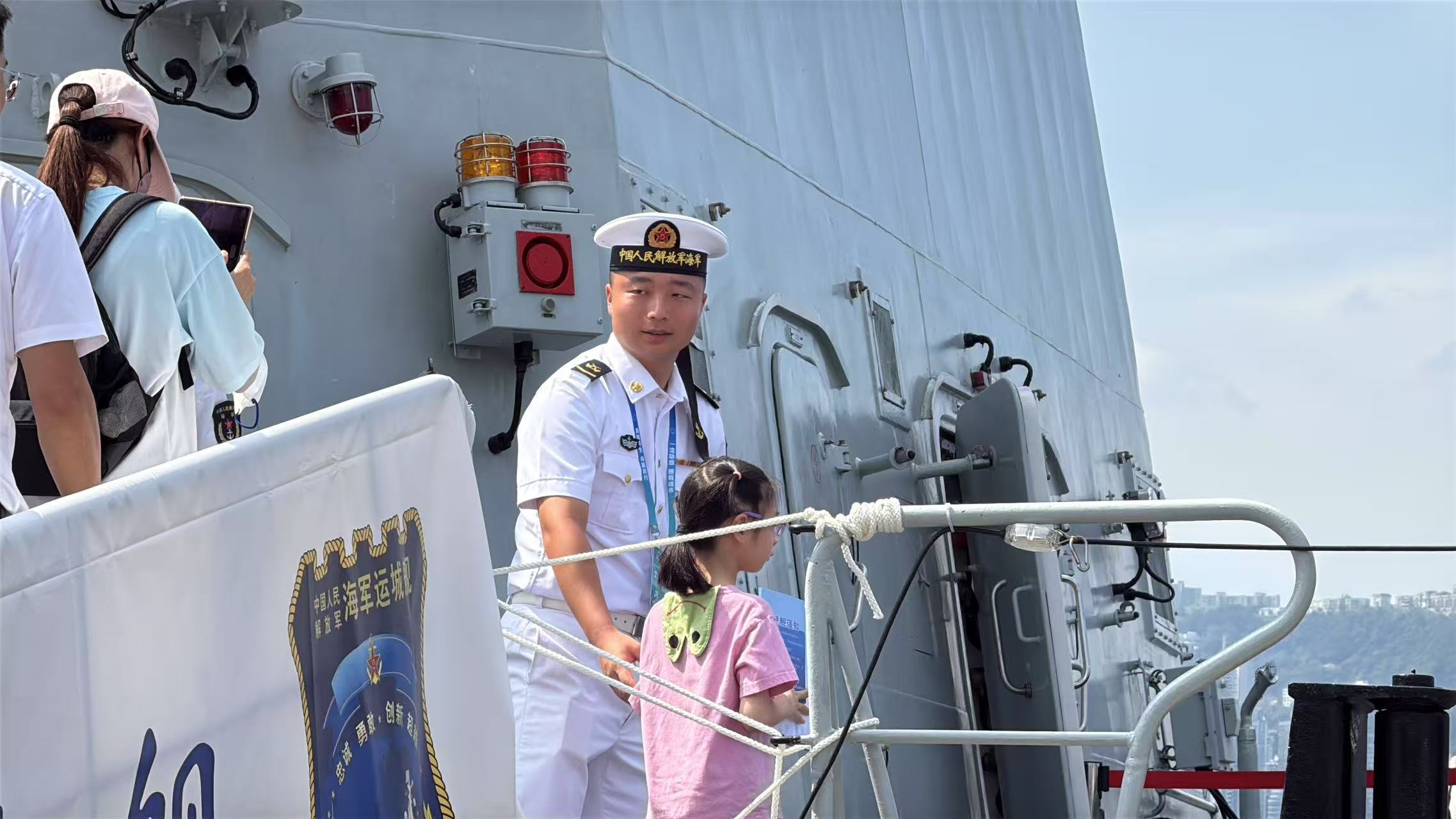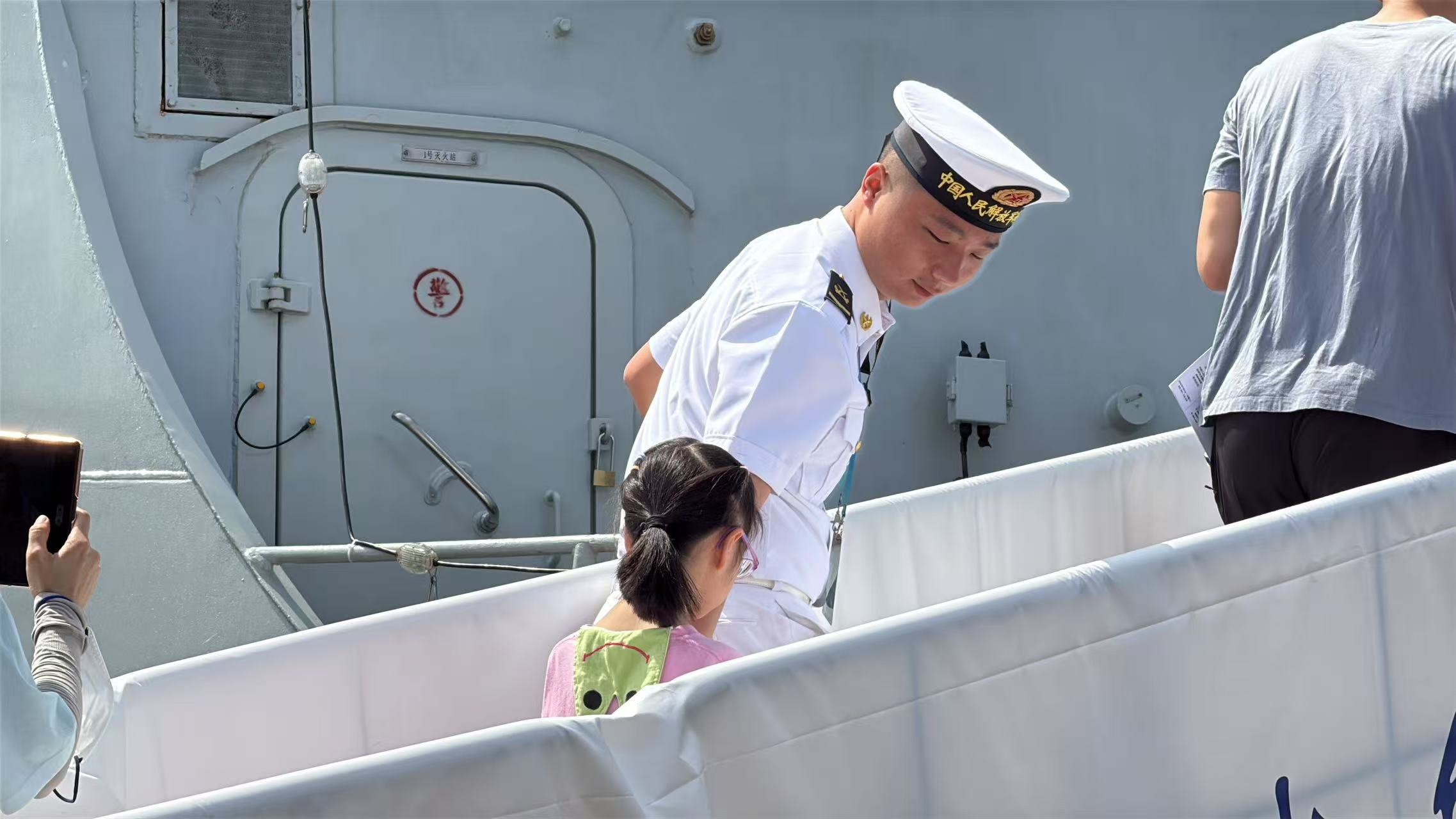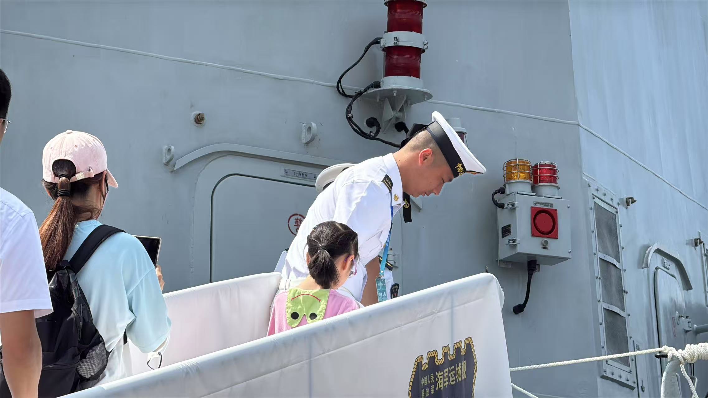 記者參觀期間看到暖心一幕,因登上運城艦的舷梯較陡且窄,一名士兵出於安全考慮,溫柔牽住小朋友的手,帶她走完舷梯,登艦參觀。