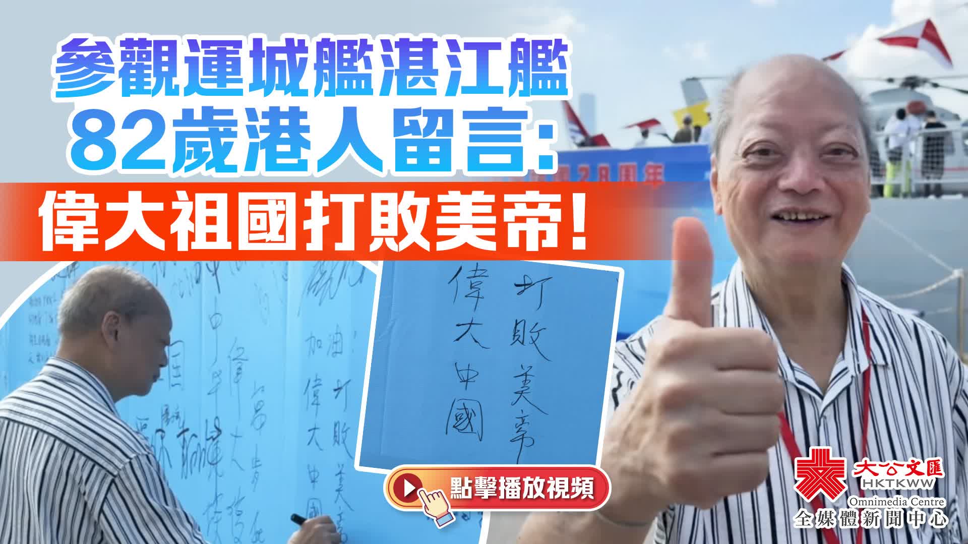 82歲的港人姚先生今天一早來參觀兩艘軍艦,在展板寫下八個大字:「偉大祖國,打敗美帝」。當被問到為什麼寫這句話時,姚先生說,以前美國時常欺負中國,現在中國強大起來,光一個稀土就能打敗美國,身為中國人感到很驕傲,希望幾年之後中國能成為世界第一強國。
