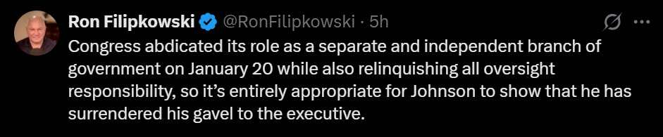 美國自由派媒體Meidas Touch主編羅恩·菲利普科夫斯基諷刺說,「國會於1月20日放棄了自己獨立於政府的職能,同時也放棄了所有監督責任,所以約翰遜向行政部門交出他的小木槌是『完全合理的』。」