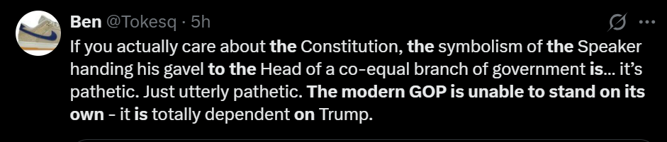 另有網友留言,「如果你真的關心維護憲法(尊嚴),那麼當議長把他的議事槌交給同等地位政府負責人的象徵意義……分明是可悲。簡直太可悲了。現代共和黨無法獨立自主——它完全依賴於特朗普。」