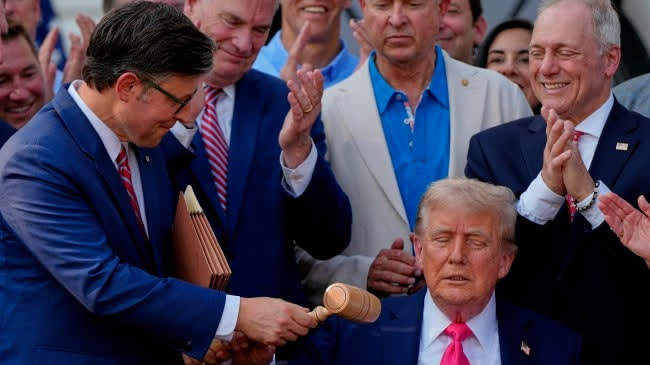 現場視頻顯示,特朗普當天在白宮簽署該法案,並向觀眾展示簽名,這時一旁的約翰遜從懷裏掏出議事槌。「總統先生,這是用來通過『大而美』法案的木槌。」約翰遜一邊說一邊把議事槌交給坐着的特朗普,「我想把它給你。」站在兩人身邊的許多共和黨議員隨即鼓掌。