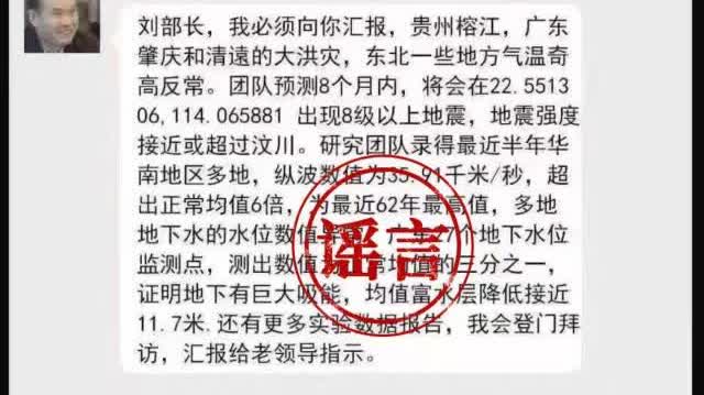 據南方+報道,近日,一張「院士預測廣東將發生8級以上大地震」的截圖在網絡上流傳。截圖顯示,名稱為「倪四道」的用戶稱,團隊預測8個月內,將會在一經緯度位置(位於廣東)出現八級以上地震。7月5日上午,記者聯繫上倪四道院士團隊的工作人員,對方表示,已經注意到相關截圖,內容並非倪四道院士發布,目前團隊已經報警。