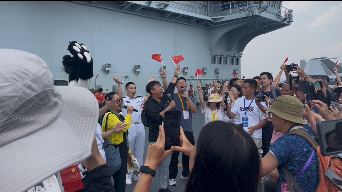 今日(7月5日),當上船參觀的市民踏上「山東艦」的那一刻,雄偉的航母甲板瞬間化作愛國情懷的舞台。在甲板開放區域,艦艇戰士們在伴奏下深情合唱《我和我的祖國》,吸引眾多市民駐足。