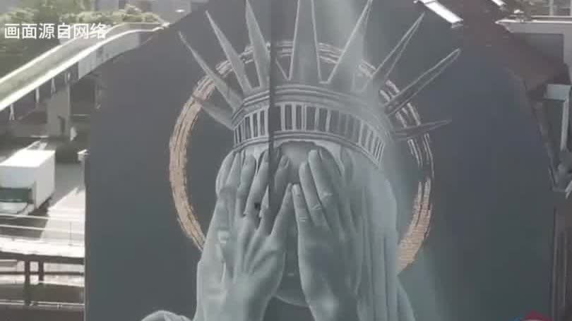 據新華社報道,7月3日,在美國「獨立日」到來前一日,一幅自由女神像羞愧掩面的壁畫作品在法國魯貝市揭幕。