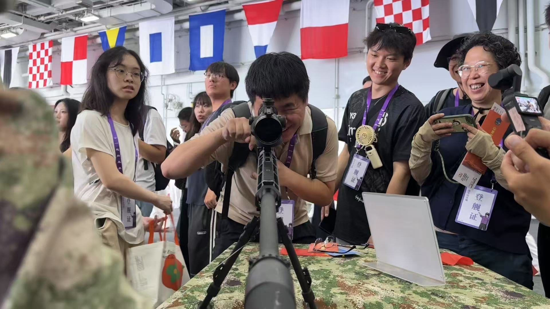 在引導員耐心引導下,大家很快就通過安檢,進入山東艦的機庫。有市民直奔歡迎台上拍照留念,也有市民在輕武器的展示區體驗武器裝備。每個武器裝備都配有講解員講解,而且市民還能「親自上陣」,體驗一把戰士的感覺。有一個值得注意的細節是,每當有市民體驗武器的時候,講解員都會用手捂住槍口作為保護,這樣的場景讓人覺得很貼心。