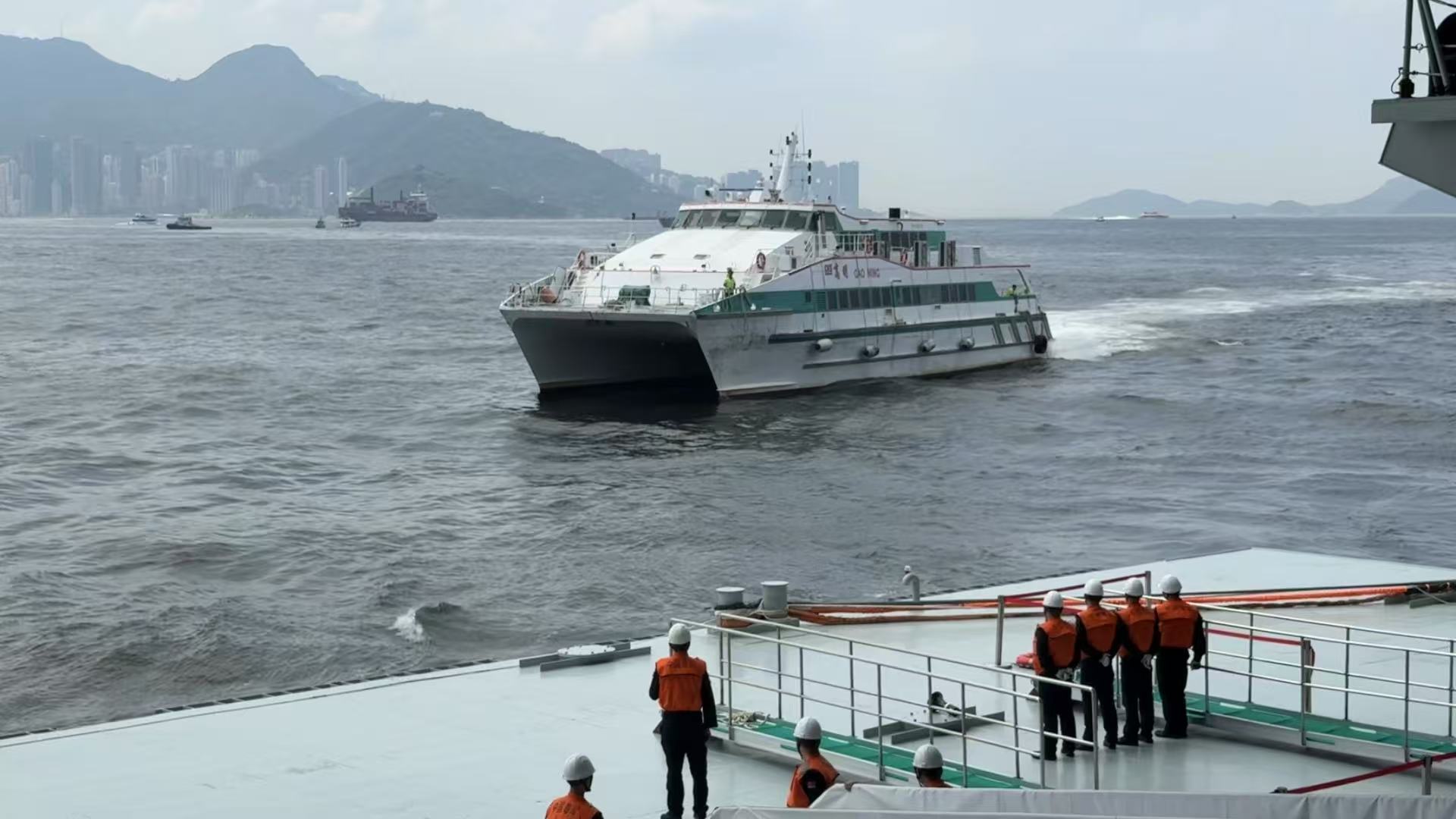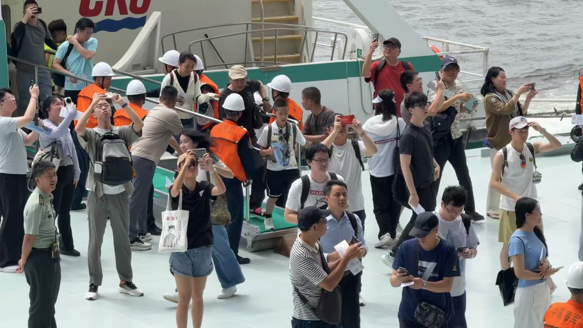 站在山東艦機庫門口,我的目光一直看向擺渡船來的方向。第一批準備登艦的香港市民乘坐擺渡船靠近山東艦時,已經能感受到他們的迫不及待——他們在擺渡船上就已經面向航母開始拍攝,舉起手機多角度記錄宏偉壯觀的航空母艦。擺渡船停定後,登艦的市民們難掩激動之情,有的市民更是小跑前進,只為早點進入山東艦打卡拍照,體驗航母上的各種互動環節。