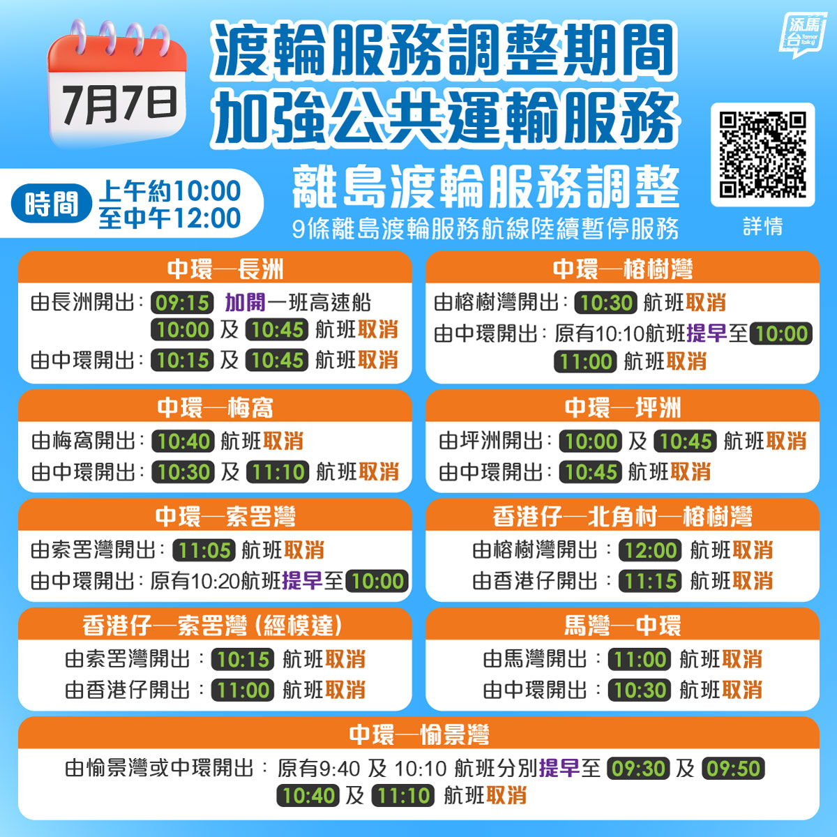7月7日上午約10時至中午12時,共9條離島渡輪服務航線將陸續暫停服務,每條航線每方向涉及取消最多兩個航班。受影響的離島渡輪包括「中環—長洲」、「中環—梅窩」、「中環—坪洲」、「中環—榕樹灣」、「中環—索罟灣」、「中環—愉景灣」、「馬灣—中環」、「香港仔—北角村—榕樹灣」、「香港仔—索罟灣(經模達)」航線。