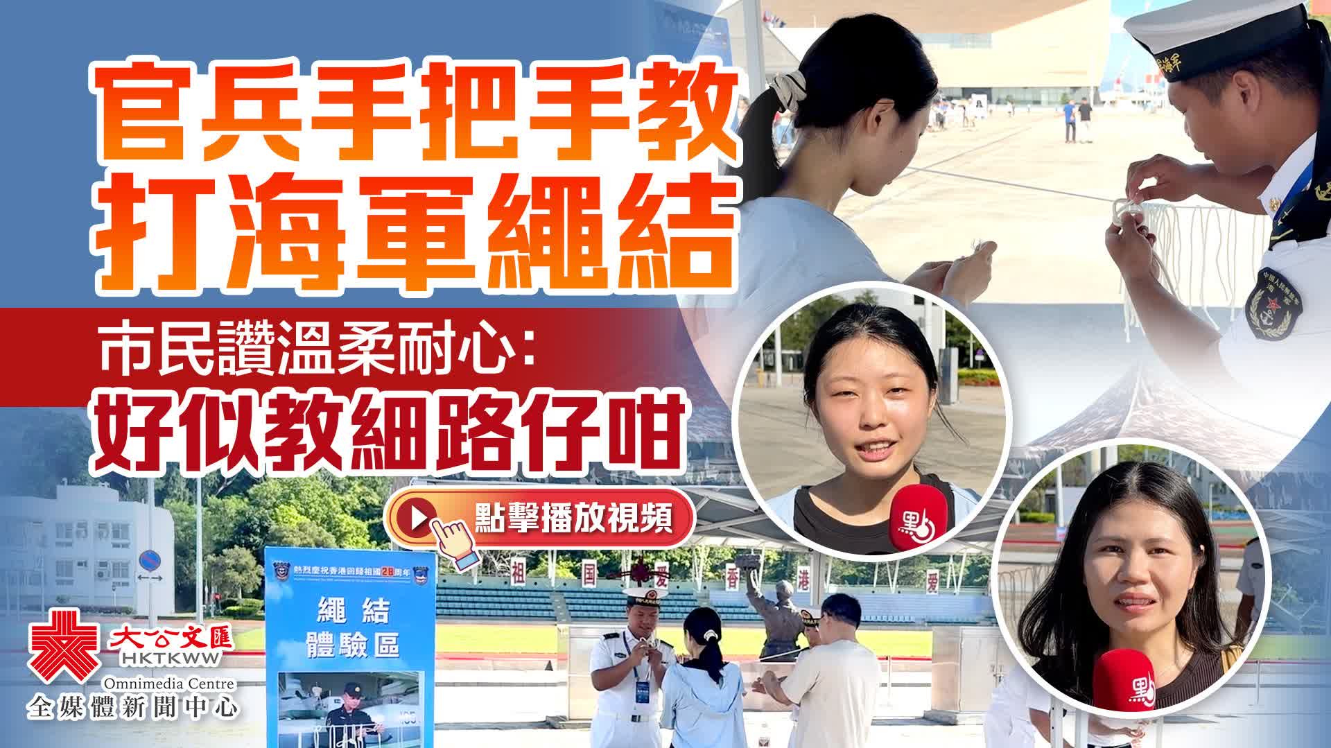 山東艦航母編隊一連5日訪問香港,停靠在昂船洲軍用碼頭的湛江艦、運城艦今天(6日)繼續迎來大批香港市民參觀。除了登艦參觀,市民還能在昂船洲軍營接觸到模擬射擊、船藝繩結製作等富有海軍特色的活動。在繩結體驗區,市民可以學習到單花結、雙花結、中環結等多種不同繩結的打法。