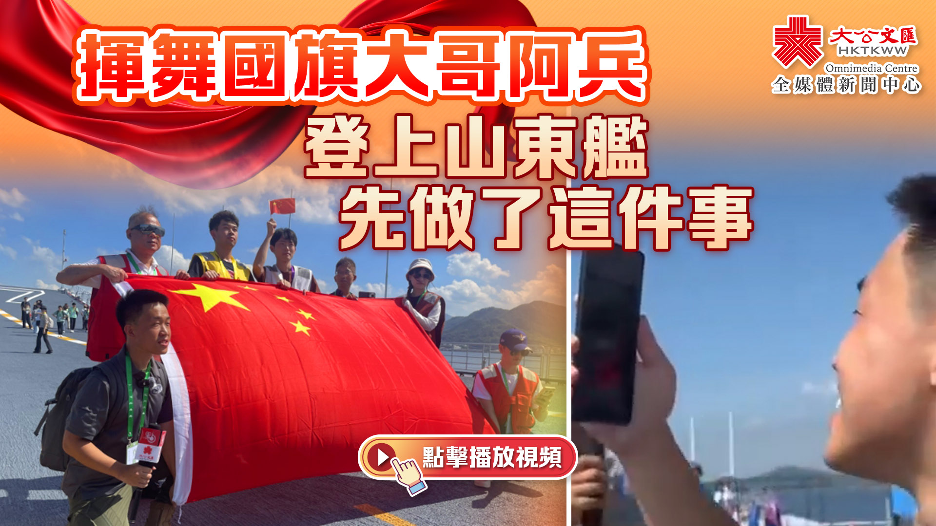 阿兵說,他沒能搶到山東艦的參觀票,但是7月3日他去玉桂山揮舞國旗迎接山東艦編隊訪港,這一事跡經過大公文匯全媒體、點新聞等媒體廣泛報道後,引起全網關注。之後,大公文匯、點新聞經過多方努力,幫助阿兵實現了登上山東艦參觀的夢想。阿兵向父親和奶奶展示了山東艦航母甲板上的場景,並且拍下了自己、父親和奶奶同山東艦航母同框的照片,通過照片見證了祖國的強大。在此過程中,阿兵亦表達對全國網友和媒體,特別是感謝大公文匯全媒體和點新聞的全力協調,感謝大家一起努力,把他送到了山東艦的甲板上。