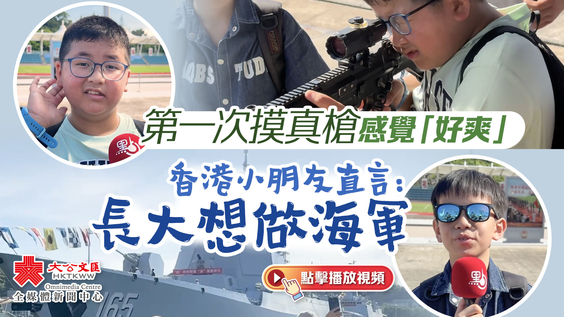 大公文匯全媒體報道,山東艦航母編隊一連5日訪問香港,停靠在昂船洲軍用碼頭的湛江艦、運城艦今天(6日)繼續迎來大批香港市民參觀。現場設有槍械、防火服、繩結和信號旗體驗區,不少小朋友在官兵指導下接觸槍械,心情興奮。
