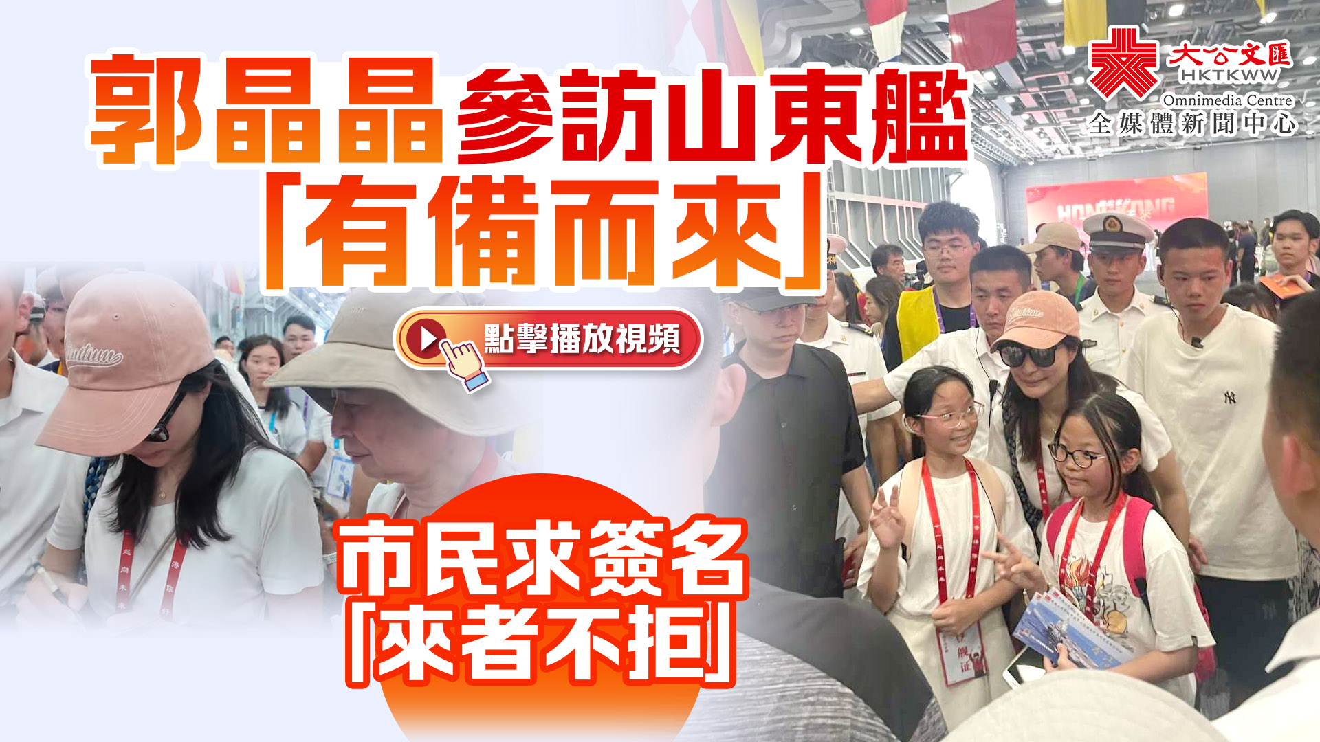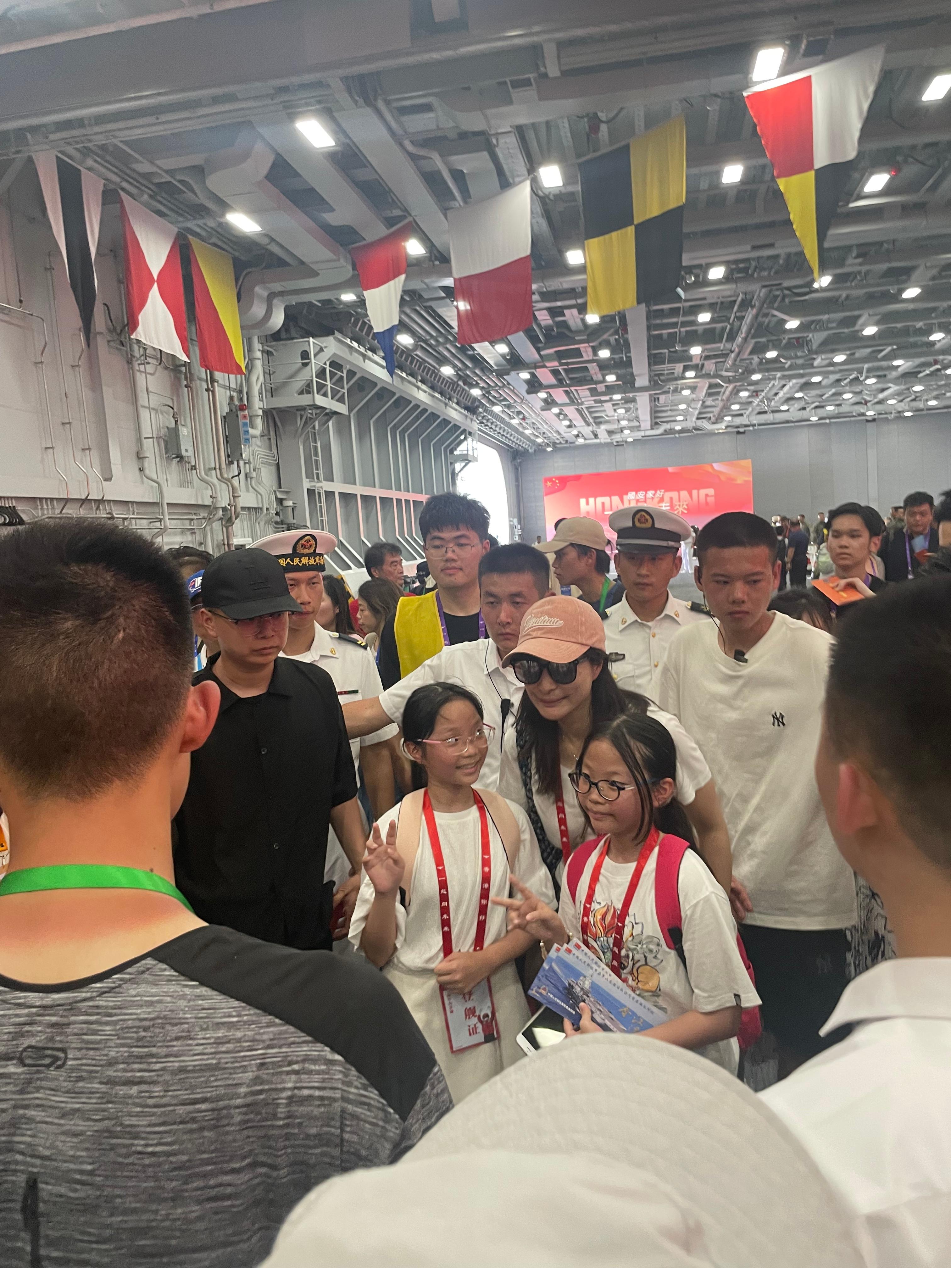 大公文匯全媒體報道,山東艦航母編隊一連5日訪問香港,今日(6日)繼續開放給香港市民參觀。港協暨奧委會副會長、立法會議員霍啟剛和妻子郭晶晶來到山東艦參觀,眾多市民向郭晶晶求合照、求簽名,郭晶晶「來者不拒」,多次在合影前幫人整理儀容,結束參觀臨走時遇到小朋友也停下來合影。