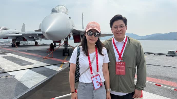 大公文匯全媒體報道,山東艦航母編隊一連5日訪問香港,今日(6日)繼續開放給香港市民參觀。港協暨奧委會副會長、立法會議員霍啟剛與妻子「跳水皇后」郭晶晶來到山東艦參觀。