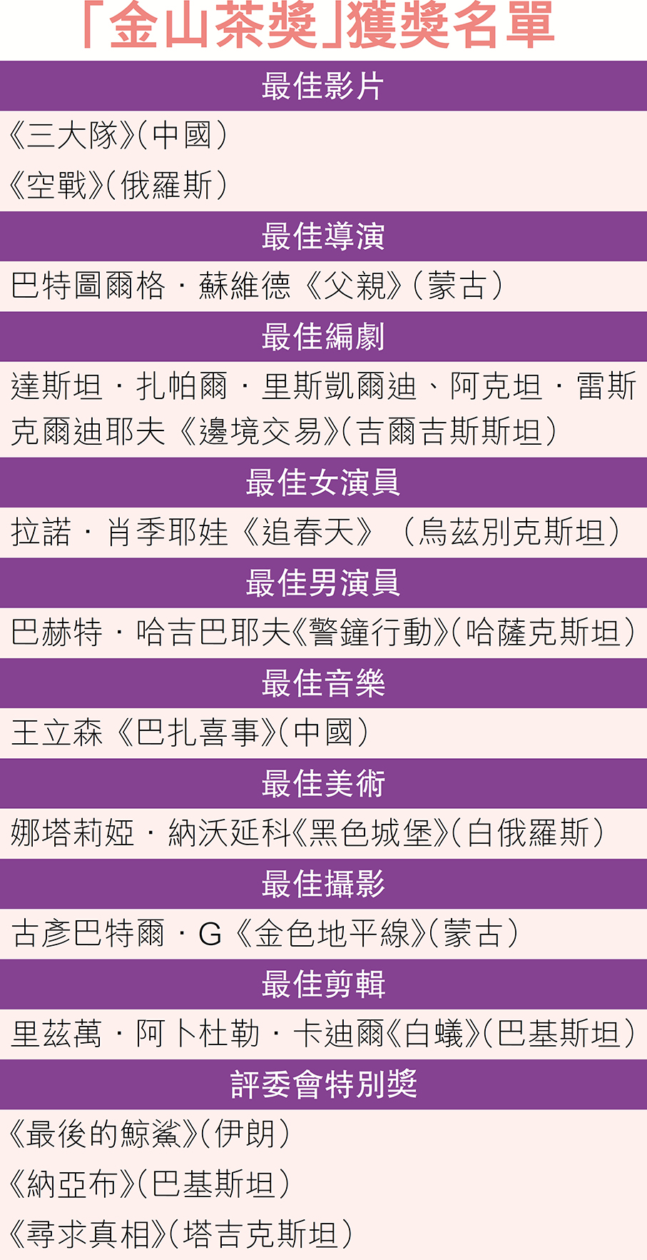 備受矚目的「金山茶獎」頒獎典禮無疑是閉幕式的核心環節 。經過激烈角逐,從中國、哈薩克斯坦、吉爾吉斯斯坦等10個國家的20部參賽影片中,各項大獎終於塵埃落定。來自俄羅斯的影片《空戰》與中國影片《三大隊》共擎最佳影片獎。