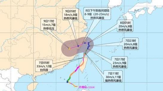 今年第4號颱風「丹娜絲」已於今天凌晨0點前後在台灣嘉義縣沿海登陸,登陸時由強颱風級減弱為颱風。預計它將向北偏東方向移動,強度逐漸減弱;8日早晨起轉向西偏南方向移動,逐漸向浙江台州至福建福州一帶沿海靠近,並於8日下午到夜間在上述沿海登陸。