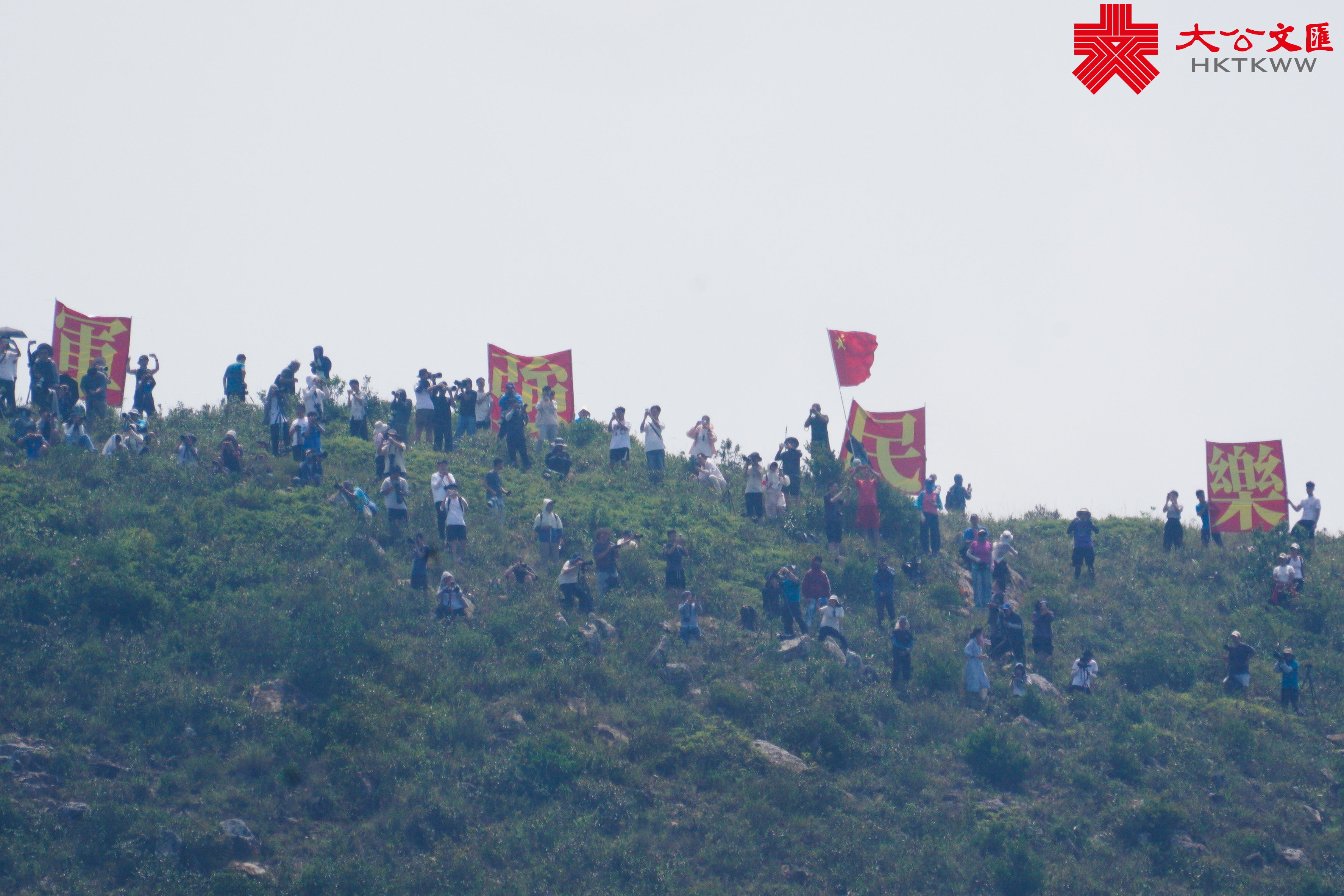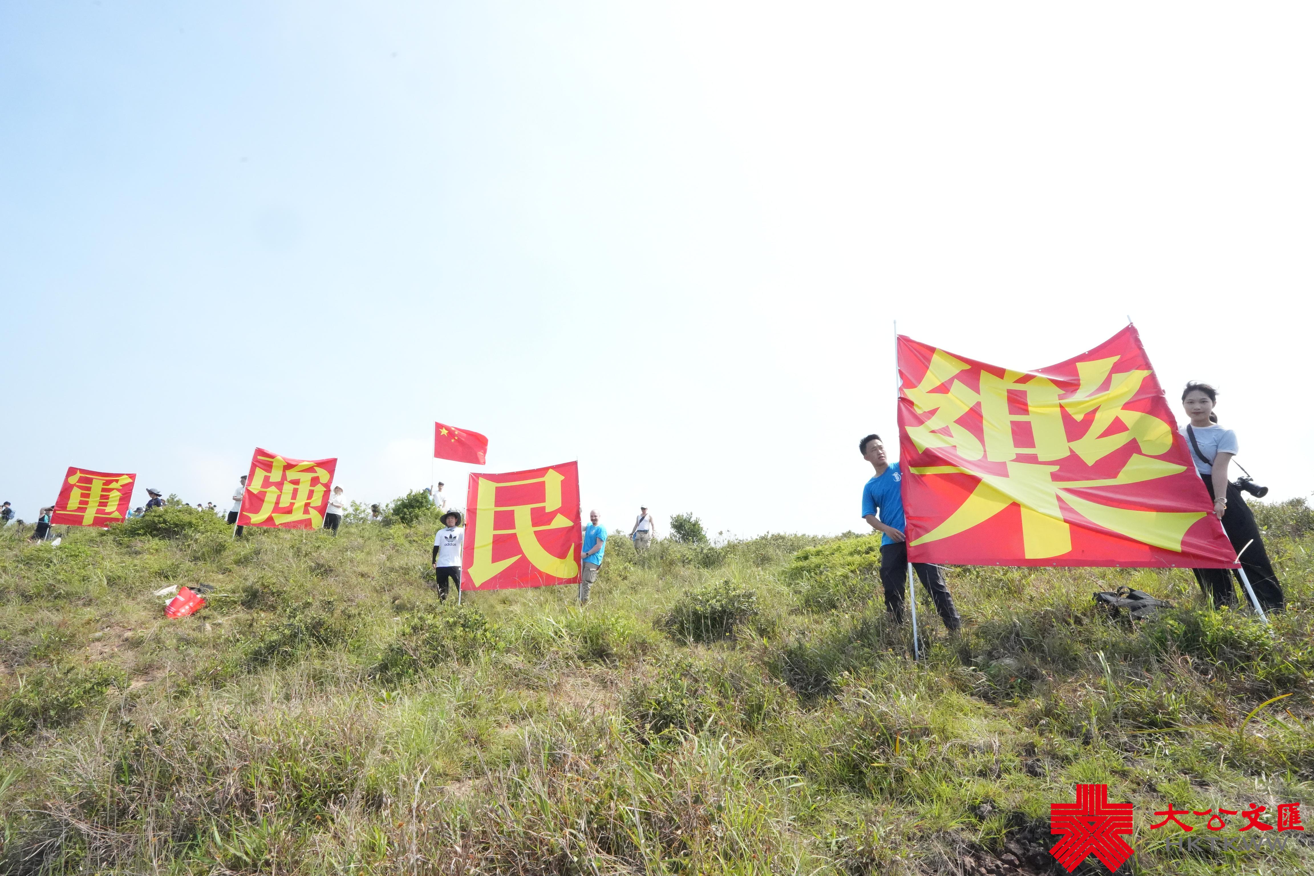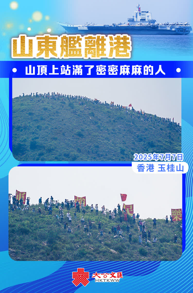 短短的五天行程很快結束,山東艦航母編隊的官兵們起錨暫別香江。今天,香港市民們帶着不捨的心情來到玉桂山頂送別山東艦。7月3日,港人阿兵和朱先生在玉桂山上揮舞五星紅旗,迎接我國首艘國產航母山東艦。他們的事跡在大公文匯全媒體、點新聞報道後,引起了全網轟動。今天,他們和一眾市民再次舉起五星紅旗,以及「軍強民樂」的紅色旗幟,來到玉桂山頂送別山東艦編隊。