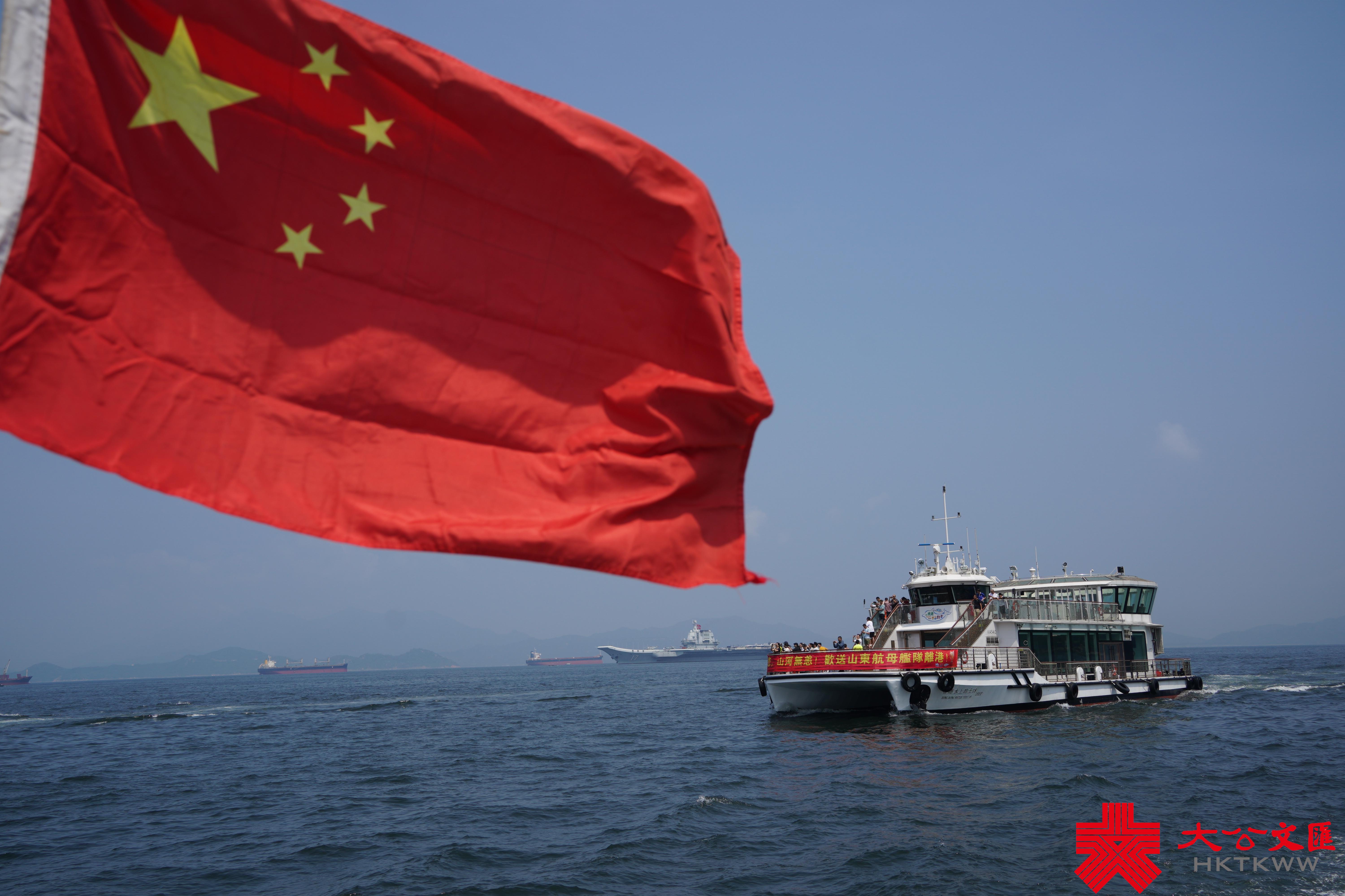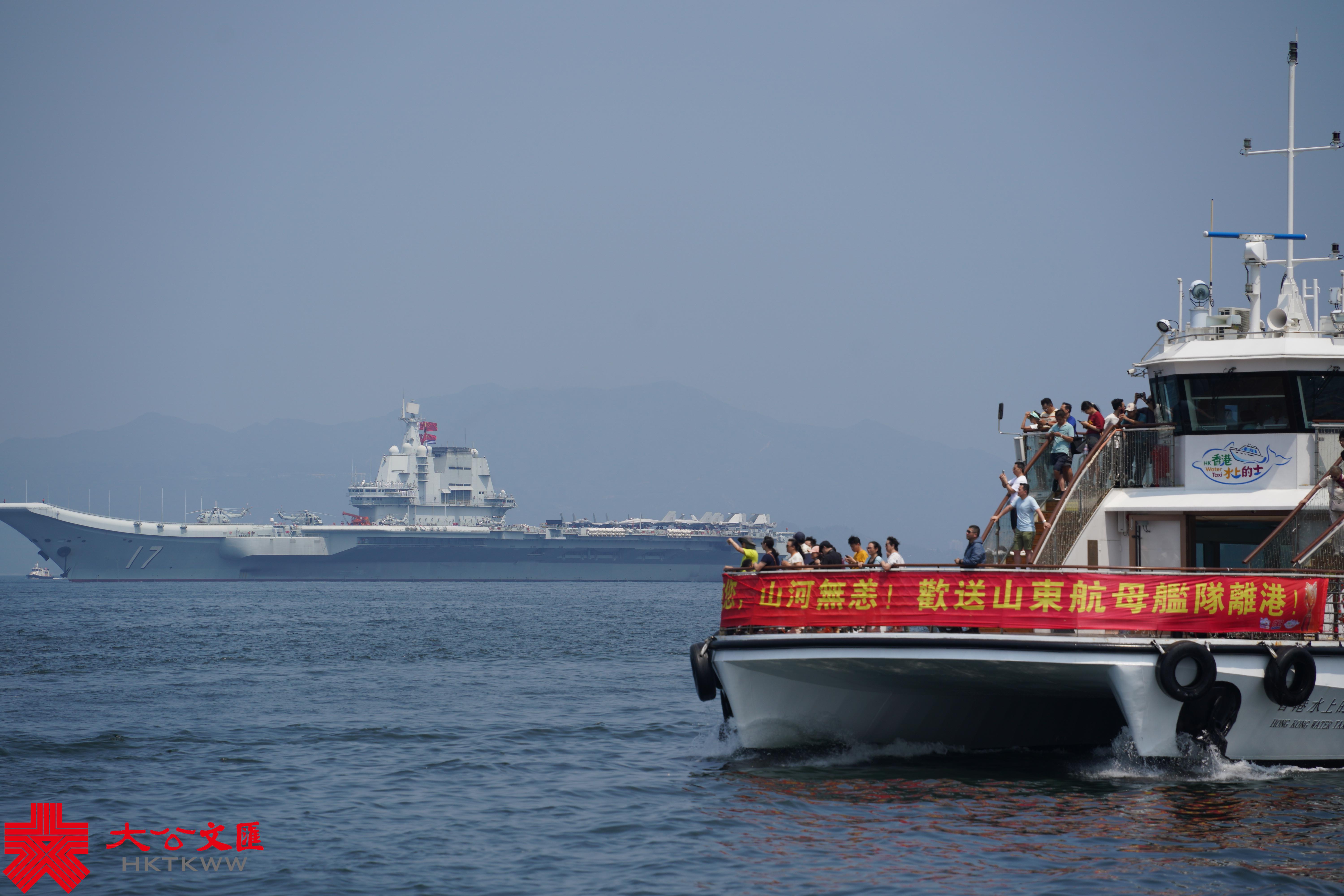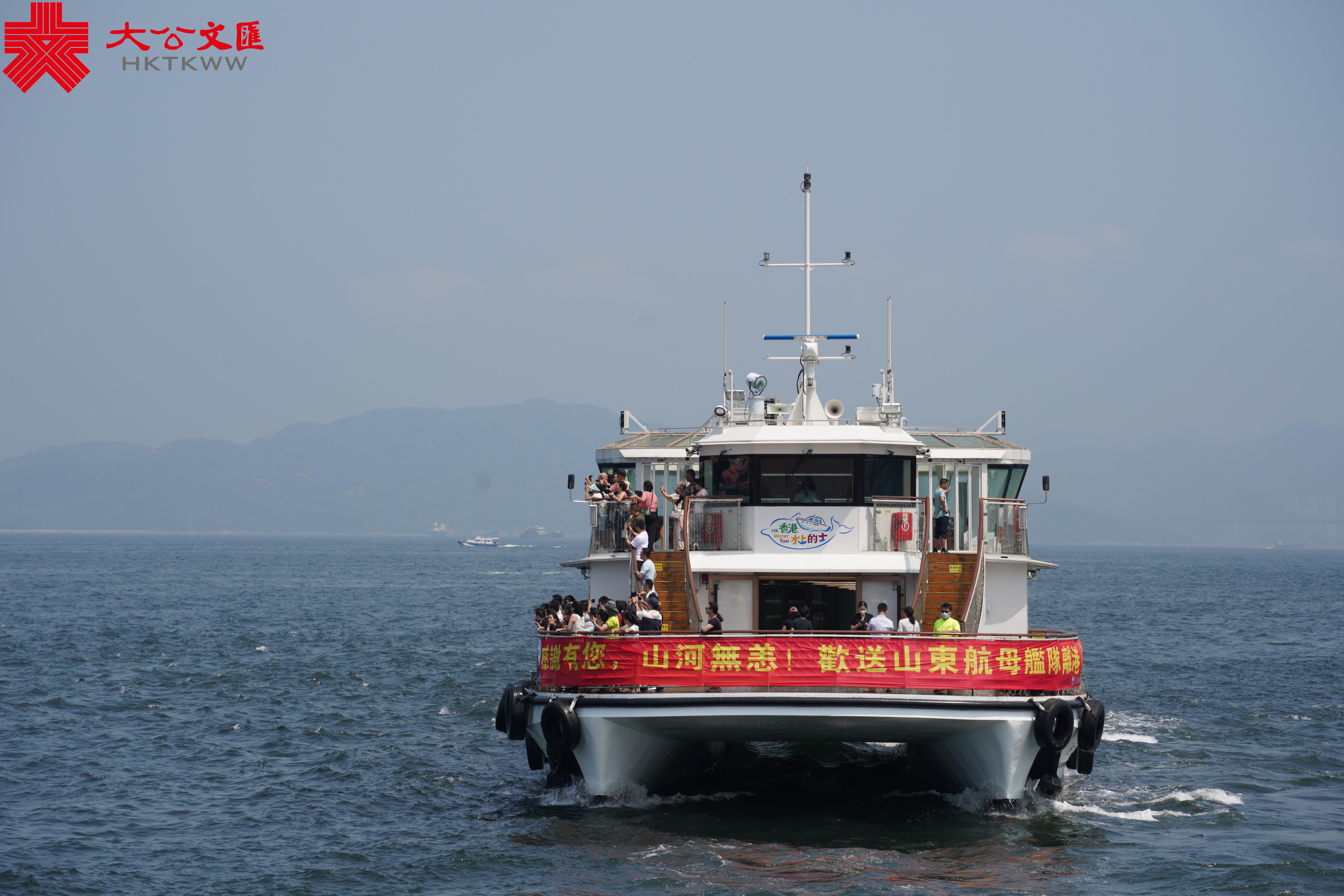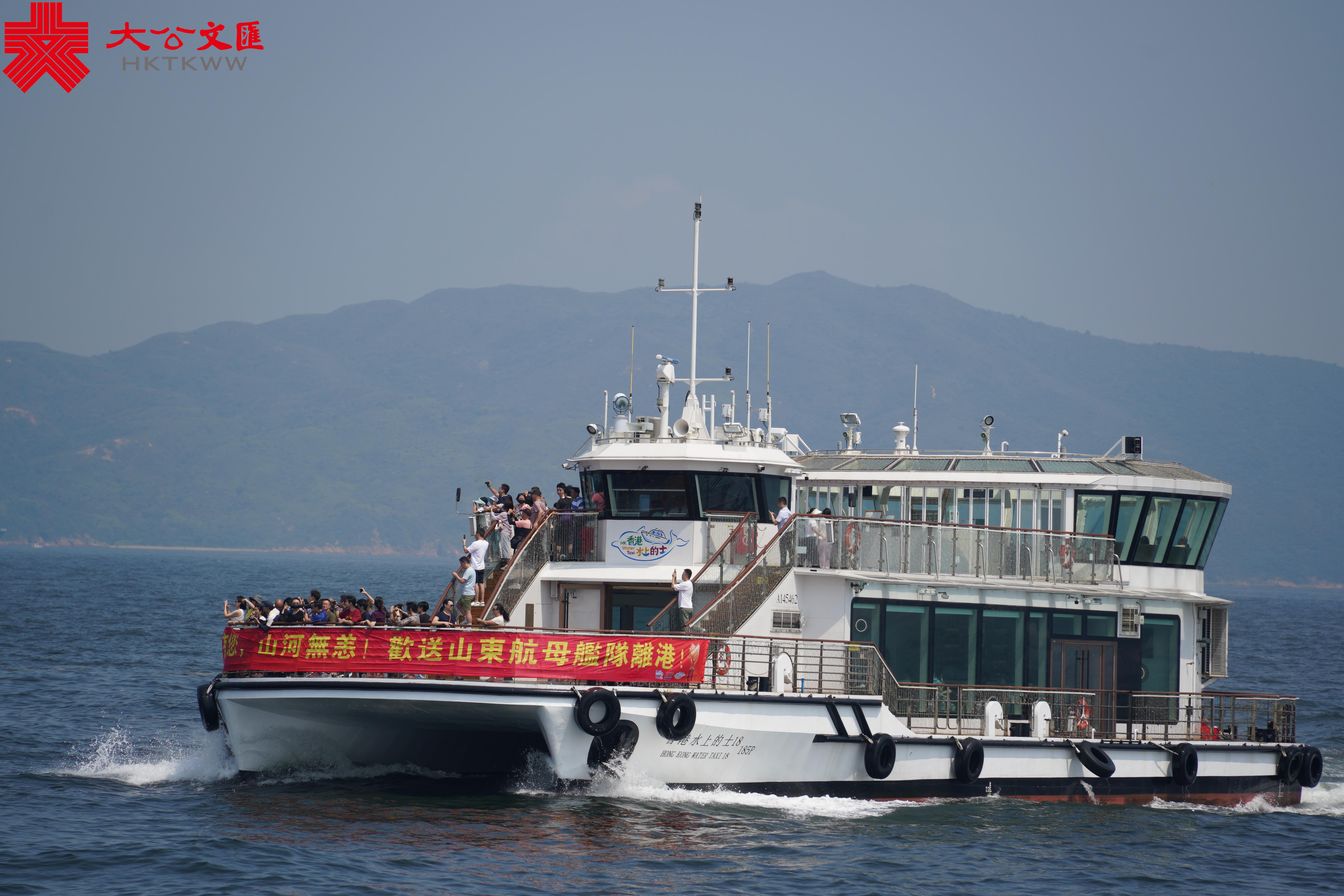 在山東艦編隊附近,還有很多市民特意乘坐渡船,同山東艦編隊作最後的道別,船首「感謝有您,山河無恙,歡送山東航母艦隊離港!」的橫幅格外引人注目。盛載香港同胞的滿滿祝福與期許,山東艦編隊為保衛國家、守疆護土繼續向深藍駛去。