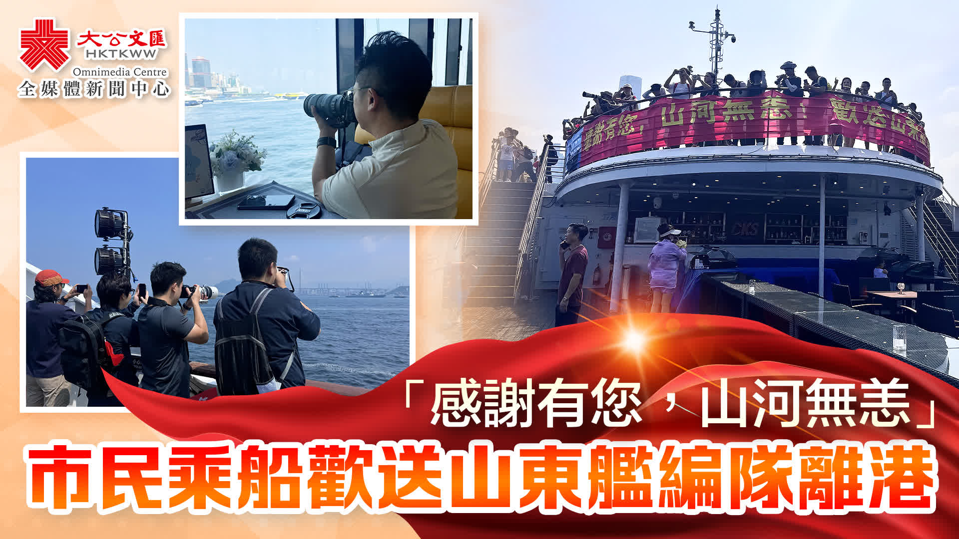 (大公文匯全媒體實習記者 梁譯尹)報道,7月3日至7日,由中國人民解放軍海軍航空母艦山東艦,導彈驅逐艦延安艦、湛江艦及導彈護衛艦運城艦組成的航母編隊一連5日訪港,其中,我國首個完全自主設計、建造的國產航空母艦——山東艦更首次向公眾開放。今日(7日)是山東艦航母編隊訪港的最後一日,東方之珠遊船公司組織船隊,與香港市民一起歡送山東艦啟程離港。