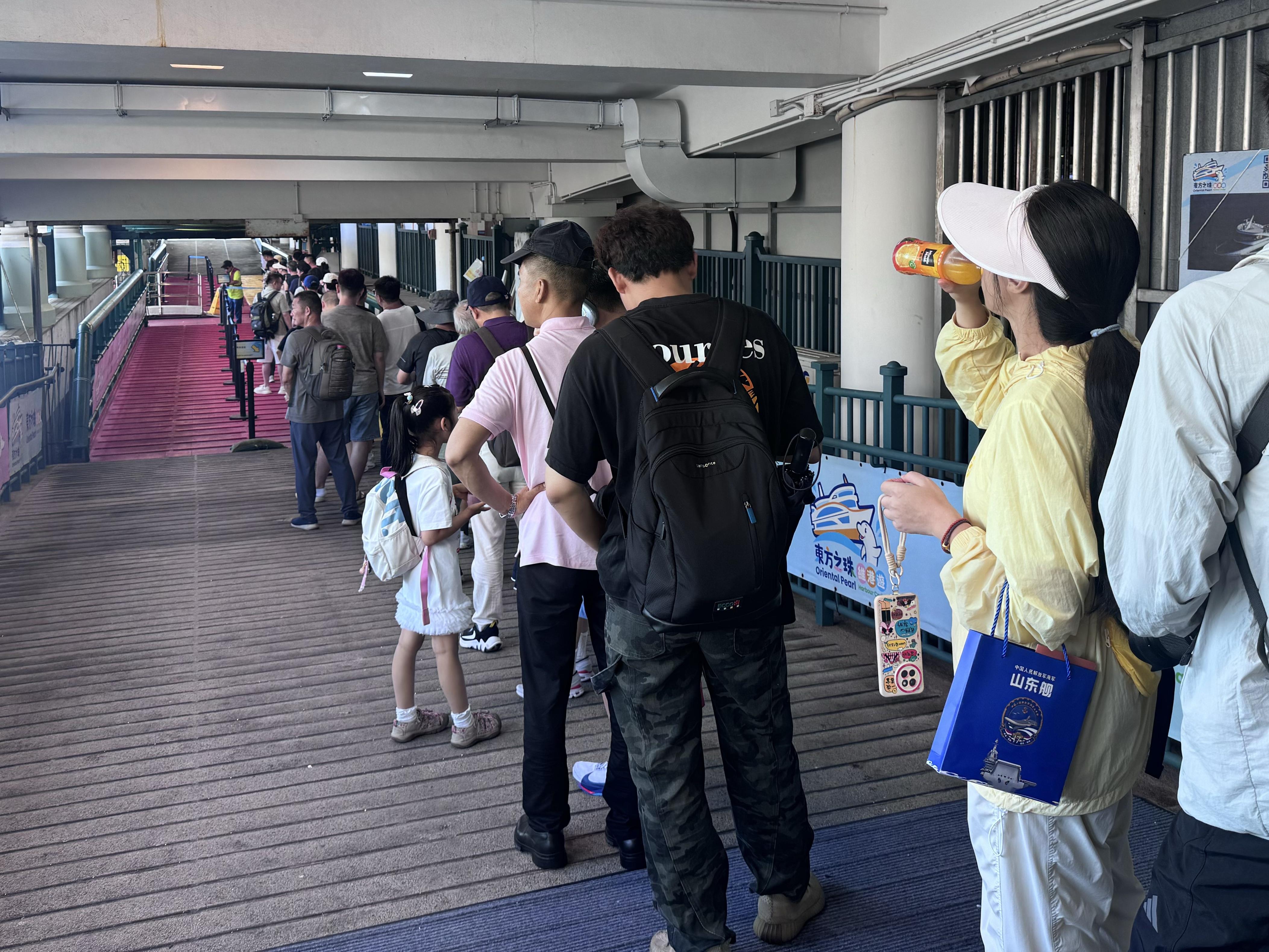 上午9時左右,記者來到中環碼頭,看見不少人正在排隊準備登船,加入到歡送山東艦的隊伍。當中除了香港本地市民,還有許多人是一家大小特意從內地來港,只為了見證中國航母編隊的宏偉盛況。