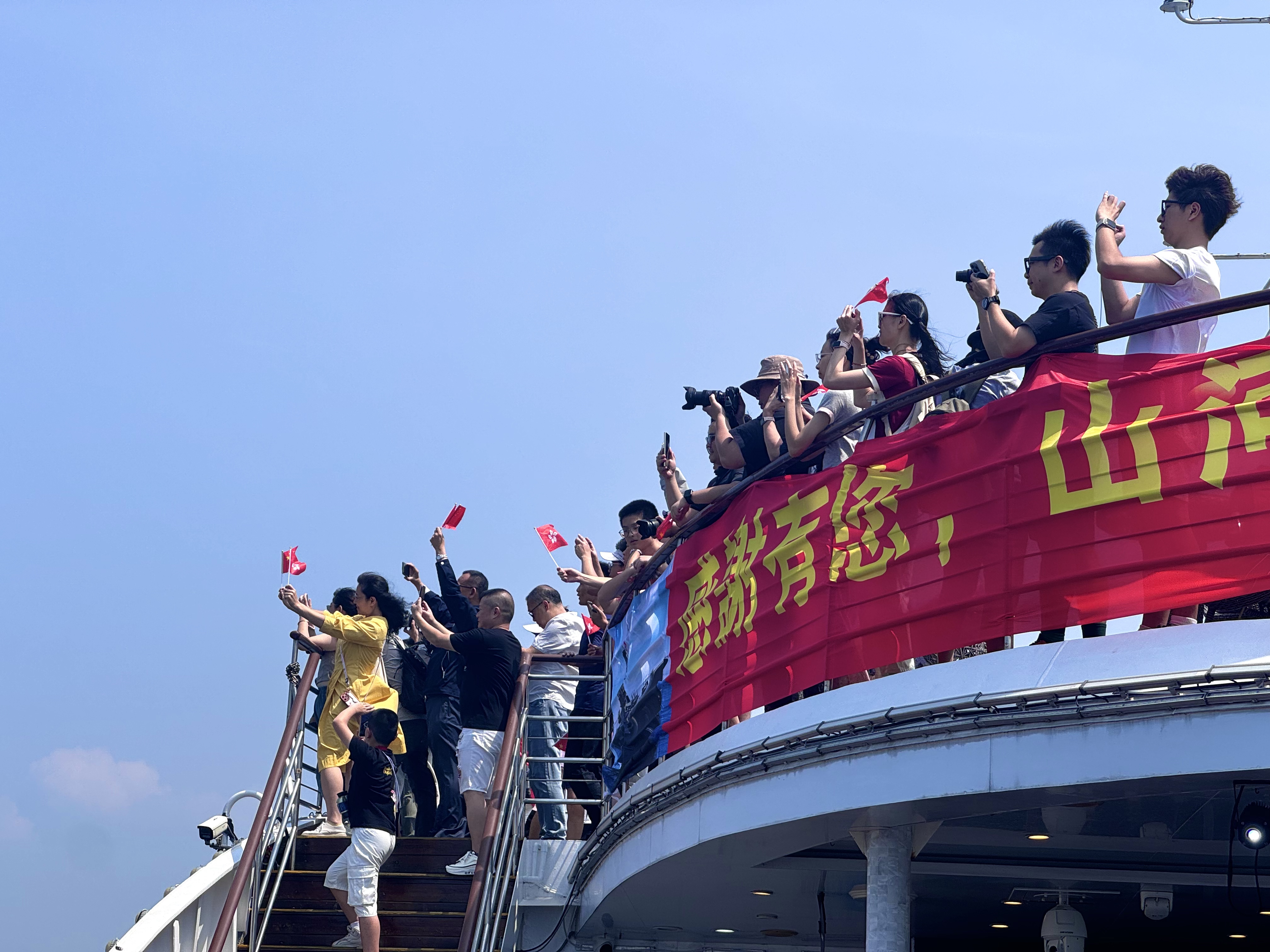隨着航行,船上歡送人群與山東艦的距離越來越近,山東艦的威武身姿也越來越清晰,此時,一位使用長焦鏡頭拍攝山東艦的市民高呼,「山東艦甲板上的官兵們好像列隊向我們揮手了!」聽聞此訊,歡送人群紛紛舉起手中的國旗與區旗,用力地揮舞着、回應着。