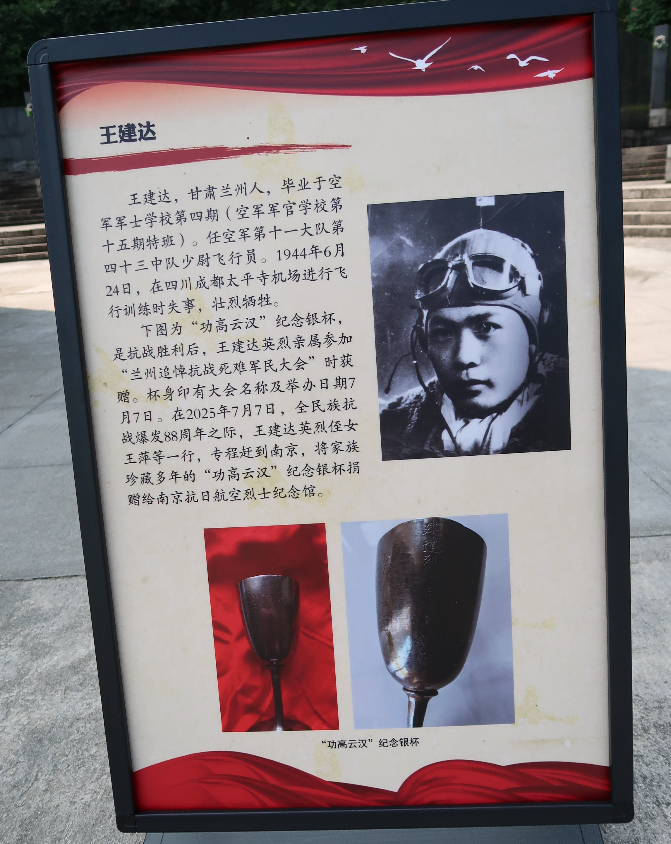 (大公文匯網 記者 陳旻 南京報道)7月7日,全民族抗戰爆發88周年之際,南京抗日航空烈士紀念館舉辦中國人民抗日戰爭暨世界反法西斯戰爭勝利80周年群眾性紀念活動。抗日航空英烈王建達的侄女王萍專程從蘭州趕來,代表家族將承載家族80年記憶的珍貴文物「功高雲漢」紀念銀杯,捐贈給南京抗日航空烈士紀念館。王萍現場表示,「我們希望這隻銀杯不再只是家族私藏的紀念,而是成為連接歷史與當下的紐帶,讓更多的人透過它觸摸到先輩的家國情懷和用生命護家國的勇氣擔當。」