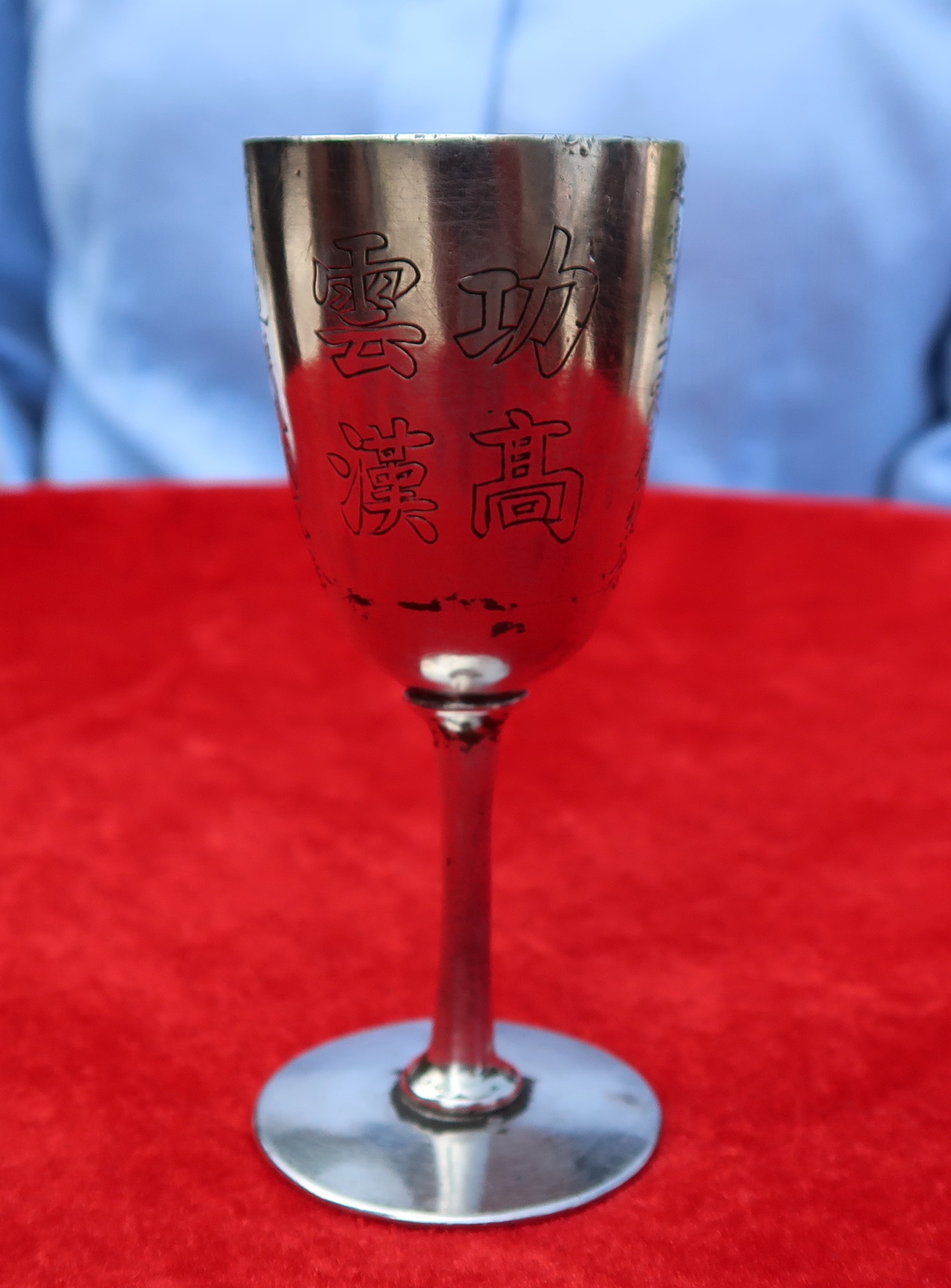1946年7月7日,在「蘭州追悼抗戰死難軍民大會」上,王建達英烈的親屬獲贈一隻珍貴的「功高雲漢」紀念銀杯。杯身刻着大會名稱、「建達烈士家屬紀念」、大會舉辦日期等字樣。