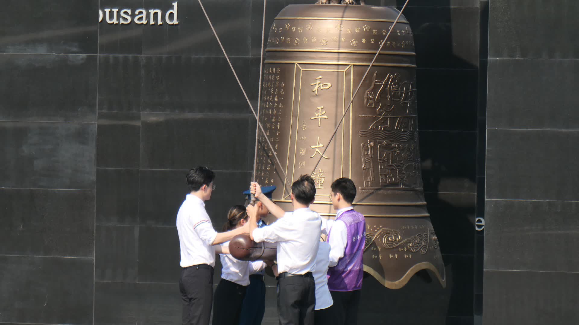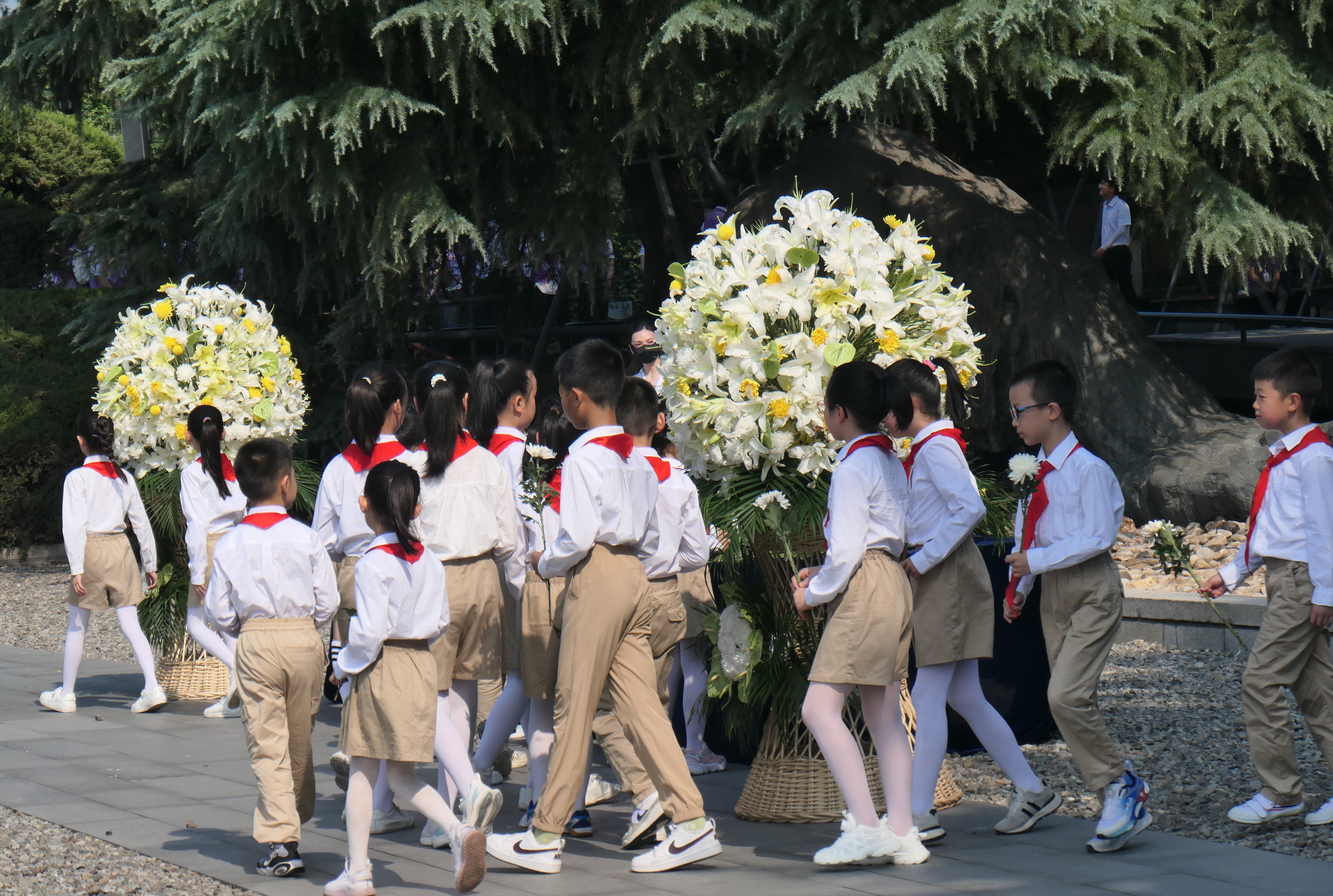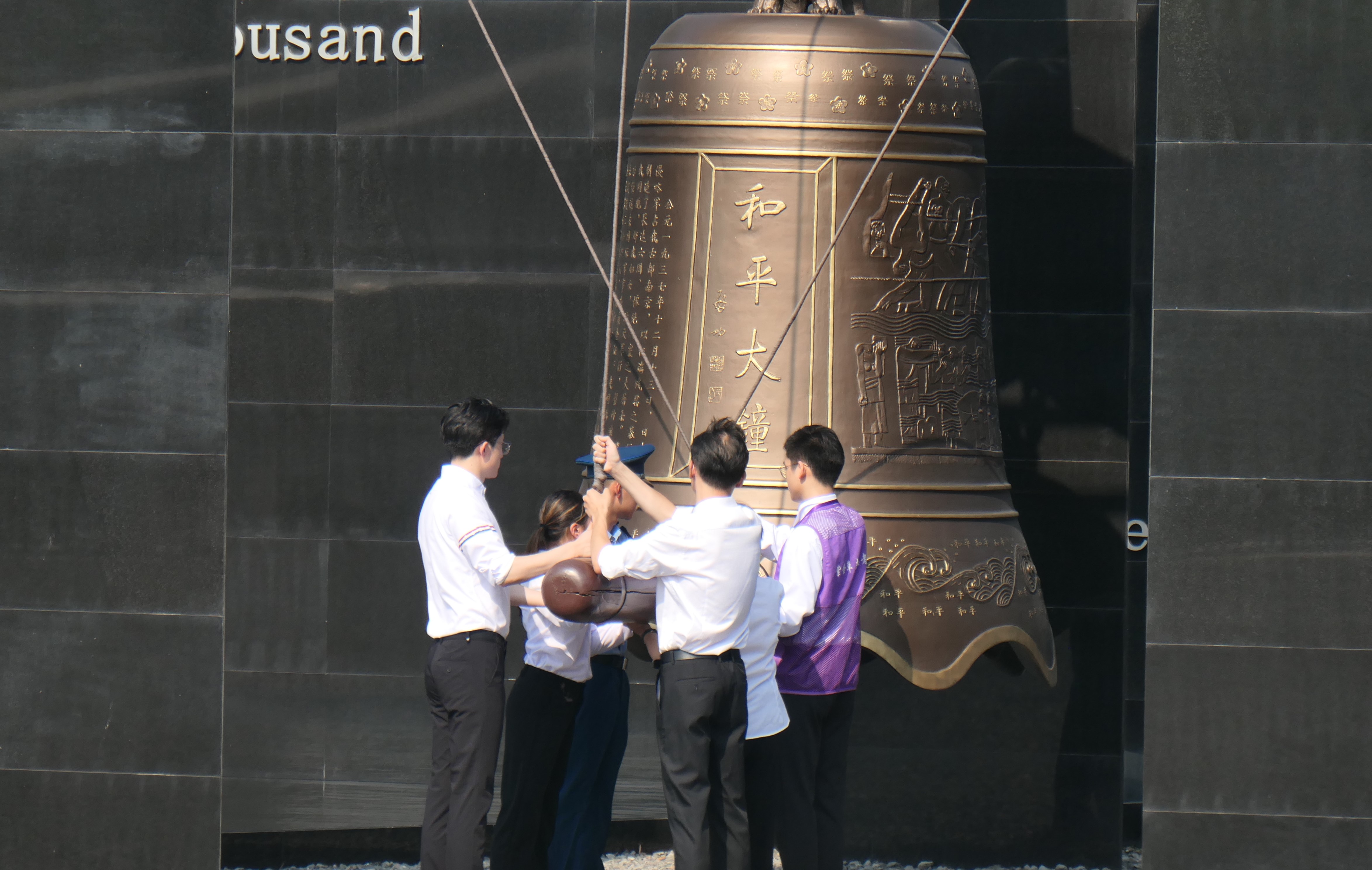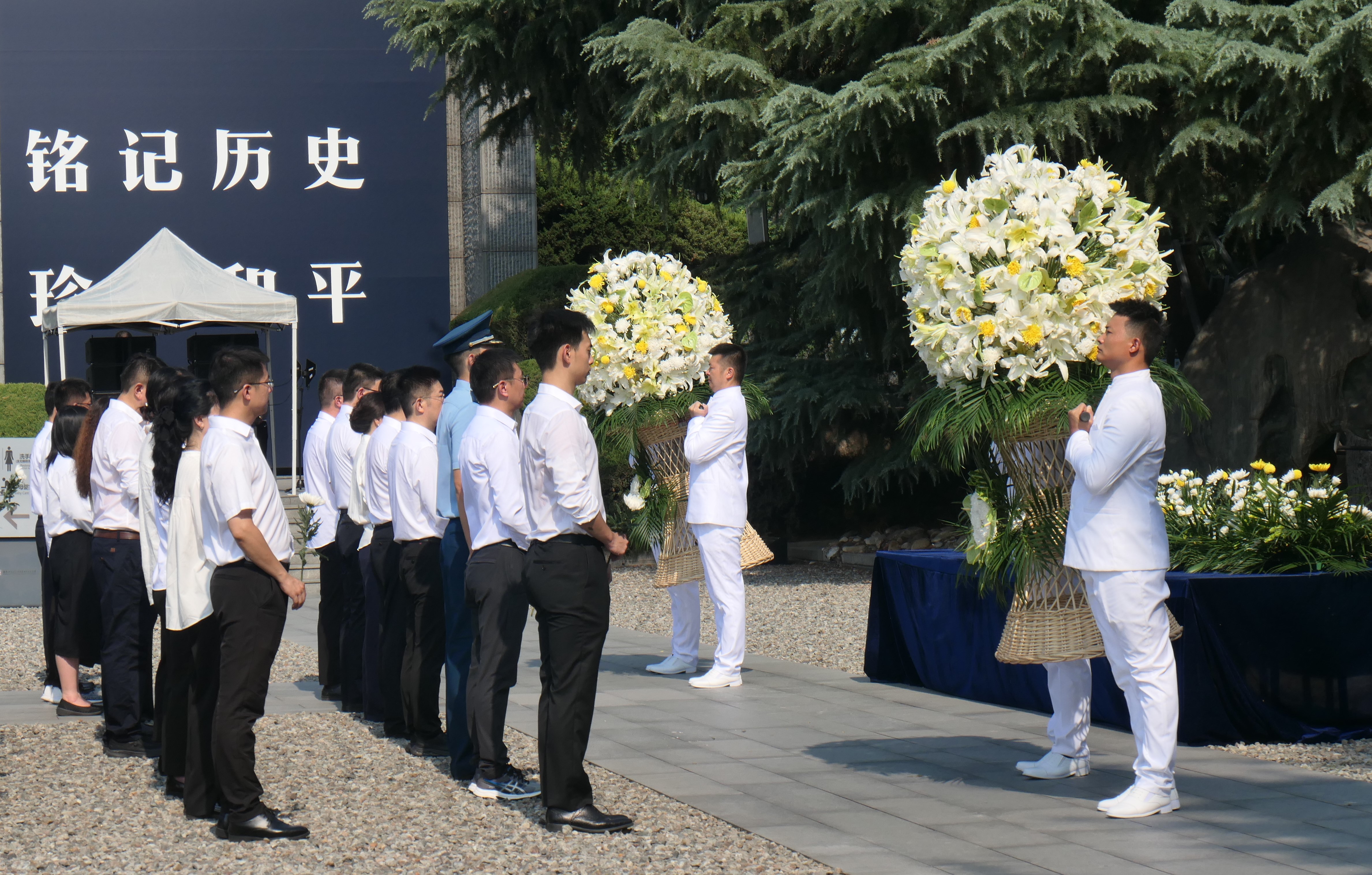 當天上午,南京各界代表在紀念館撞響和平大鐘,警示國人銘記歷史、珍愛和平。紀念館儀仗隊向南京大屠殺無辜死難者、慘遭日本侵略者殺戮的死難同胞、為中國人民抗日戰爭勝利獻出生命的革命先烈和民族英雄、同中國人民攜手抗擊日本侵略者而獻出生命的國際戰士和國際友人敬獻花籃,隨後,南京大屠殺倖存者後代、南京市青少年、社區居民、紀念館工作人員和紫金草志願者等各界代表依次獻上鮮花,寄託哀思。