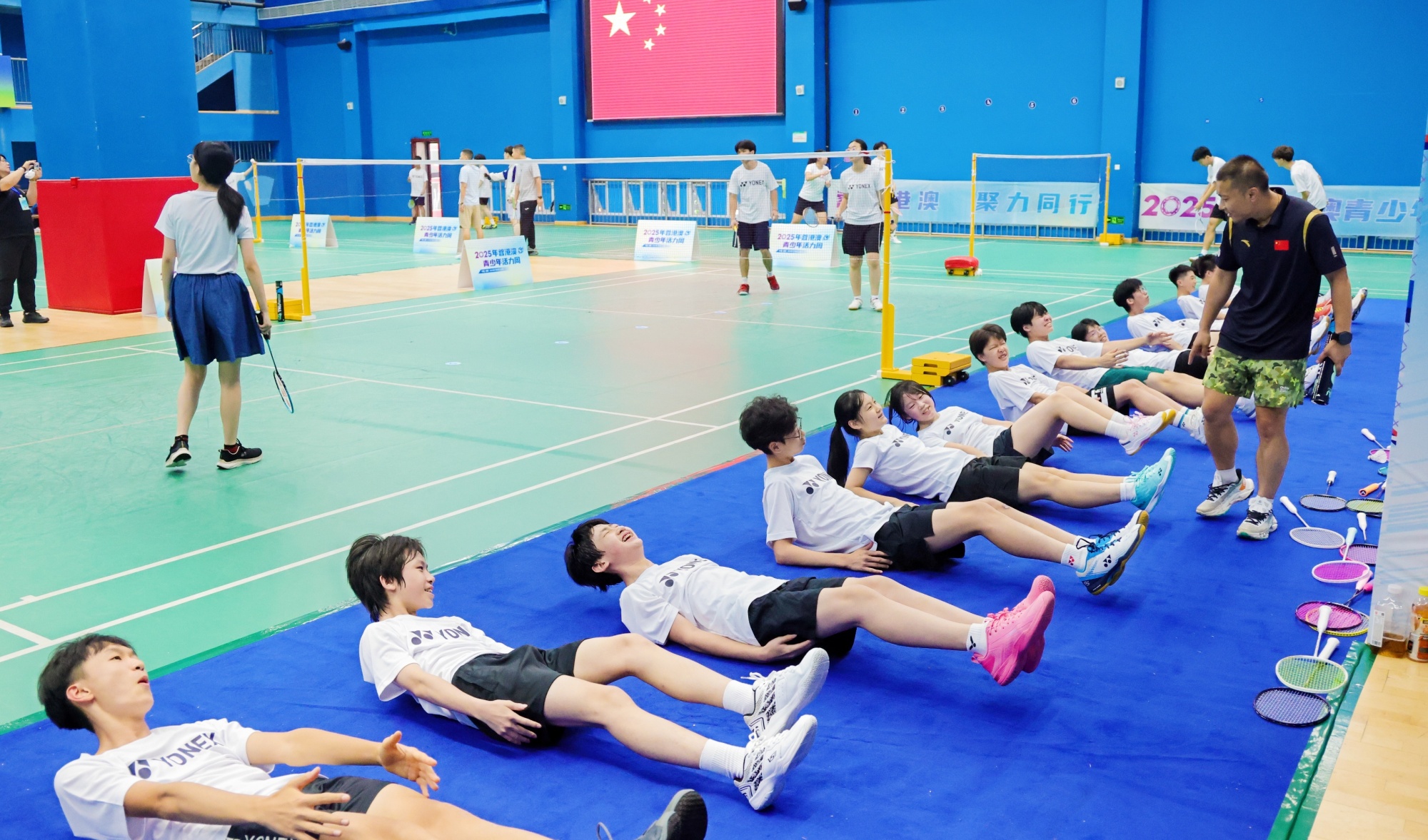 7月7日上午10時許,現場授課正式開始。來自蓉港澳的40名青少年被打亂分了8組,每個小組5人。教練從每小組中抽調4人進行羽毛球對練,組內剩下的一人則參與集中體能訓練。訓練場上,教練的口哨聲、球員的吶喊聲以及球與拍的撞擊聲、鞋與地的摩擦聲此起彼伏,融匯成了一曲動人的「活力」之歌。