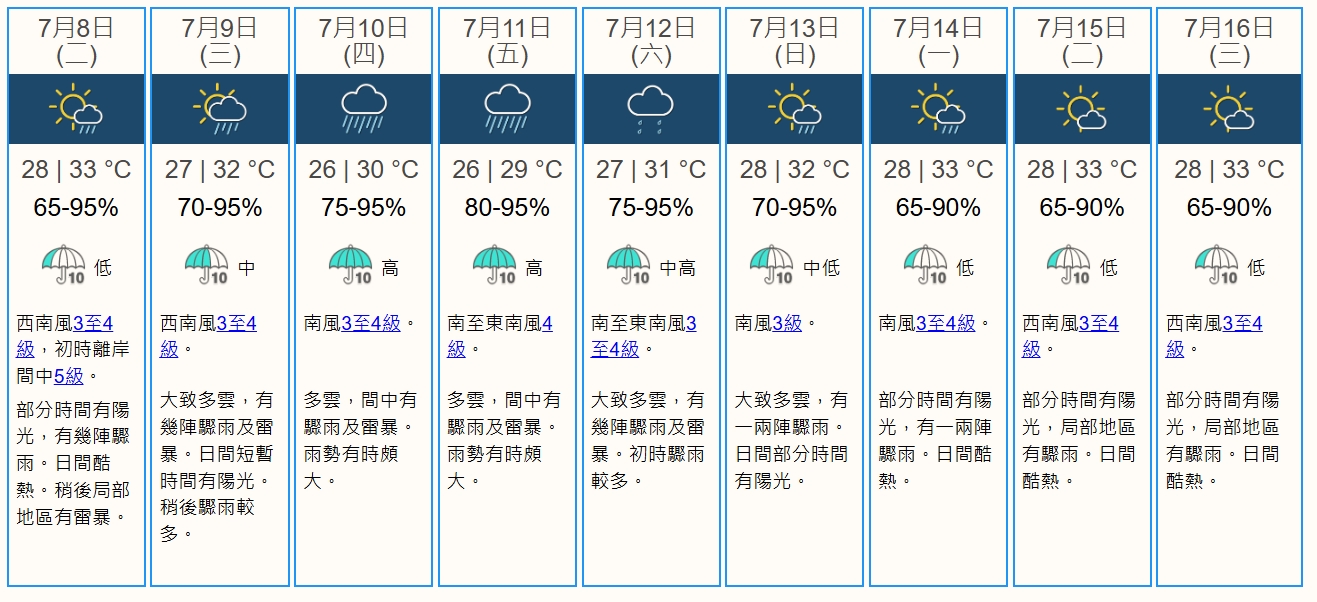 星期三日間短暫時間有陽光,稍後驟雨增多。天文台預料一道低壓槽會在本周中後期為廣東及南海北部帶來大驟雨及雷暴,預測周四及周五(10日及11日)多雲,間中有驟雨及雷暴,雨勢有時頗大,料要到下周日(13日)天色才好轉,並再度酷熱。